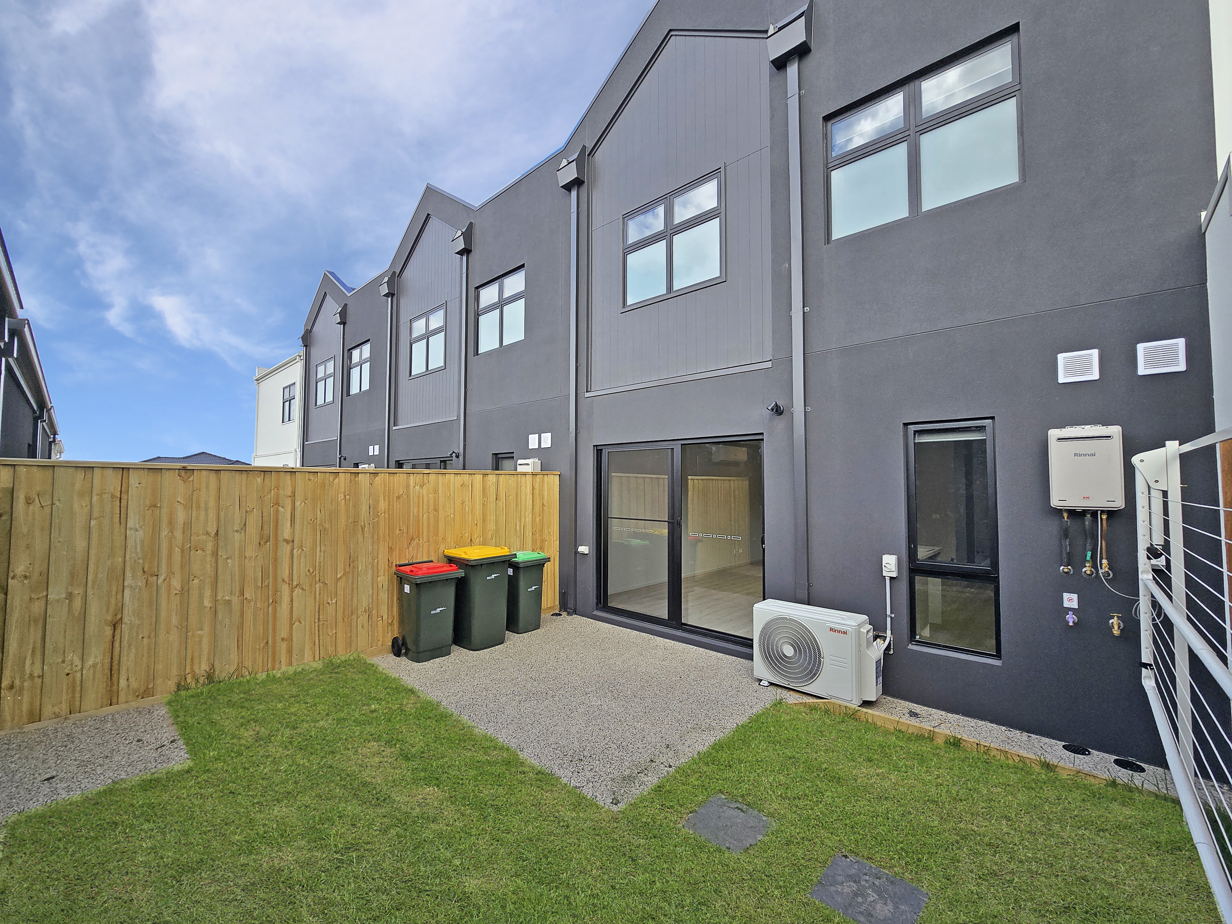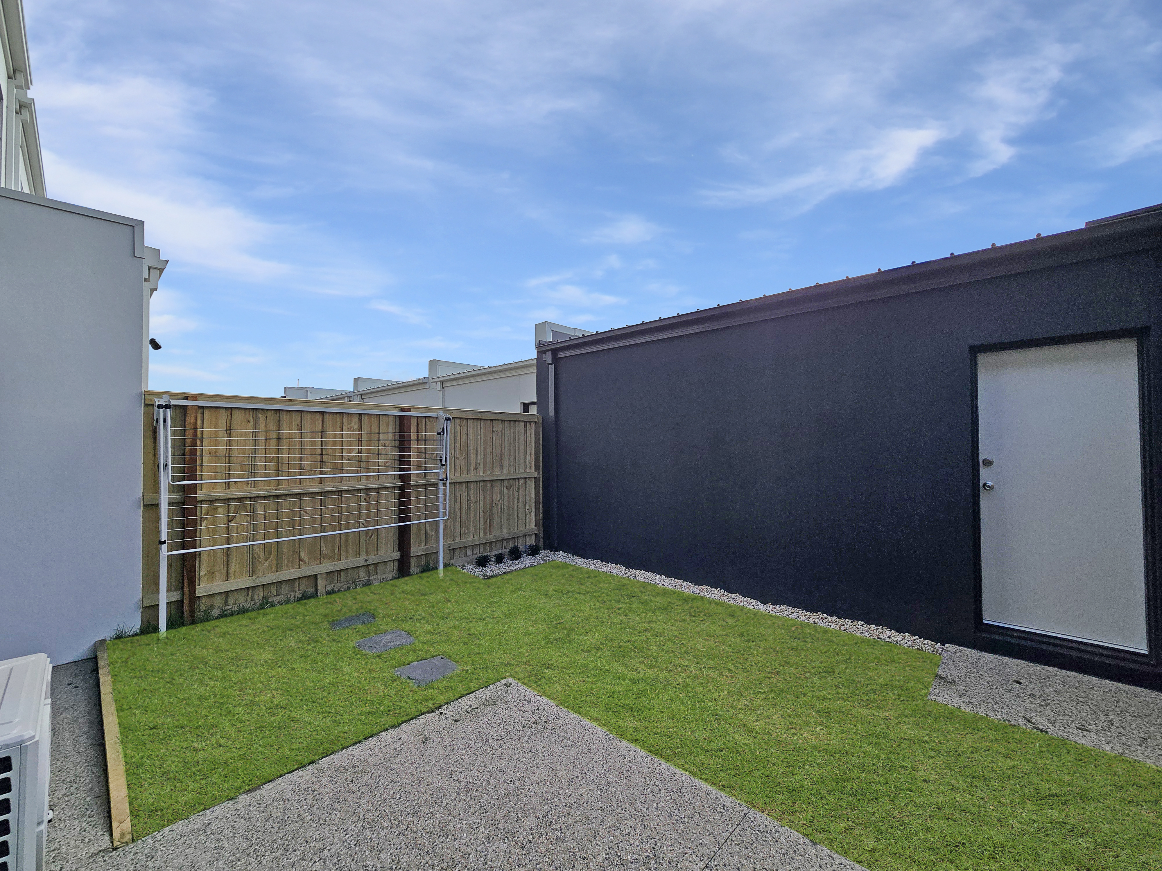 – Low-maintenance backyard with clothesline installed