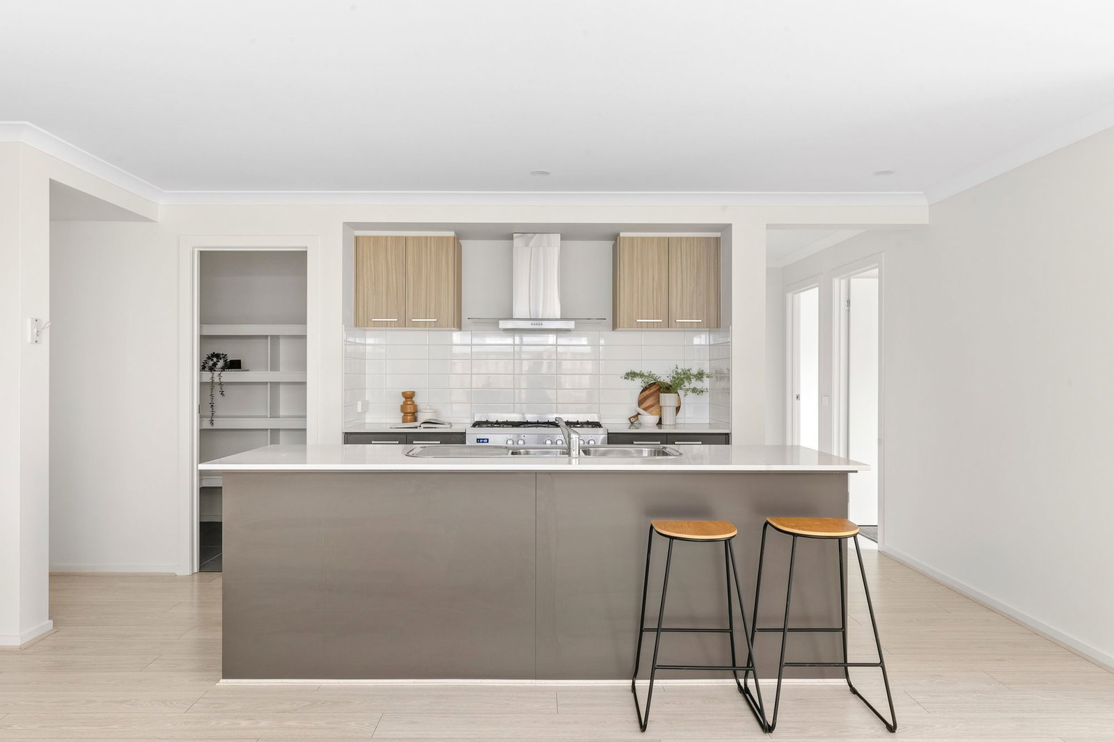 Kitchen: 900mm stainless steel gas cooktop, oven & glass finish rangehood, walk in pantry with shelving, fridge cavity, 20mm stone benchtops, double sink, chrome finishes, overhead cabinetry, storage drawers, subway tile splash back, timber laminate floorboards, island bench with overhang breakfast bar, dishwasher.