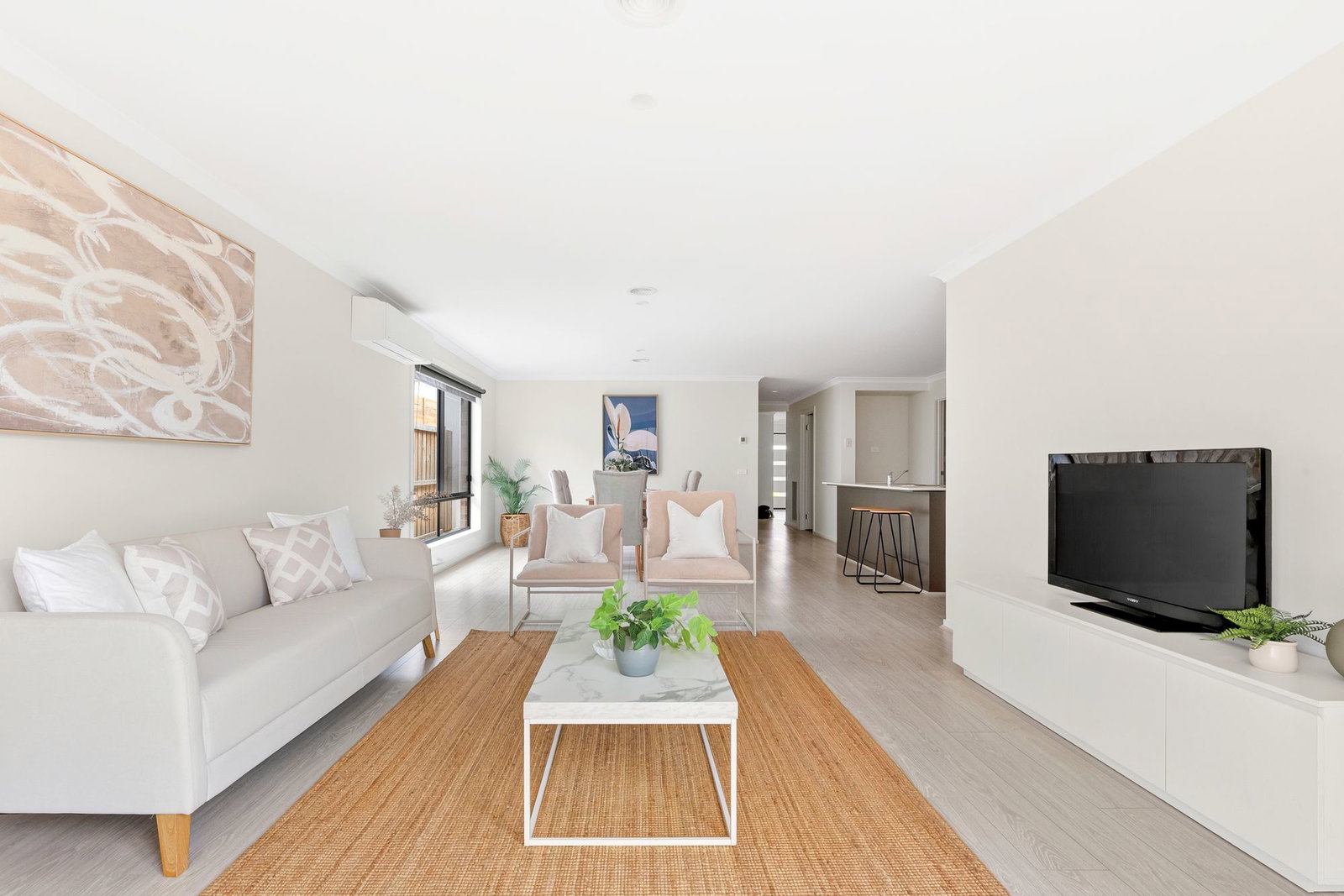 Living/dining: open plan kitchen/living/dining, expansive dining space, timber laminate floorboards, ducted heating, split system cooling, ample windows allowing natural light, roller blinds, sliding glass doors through to alfresco area & yard