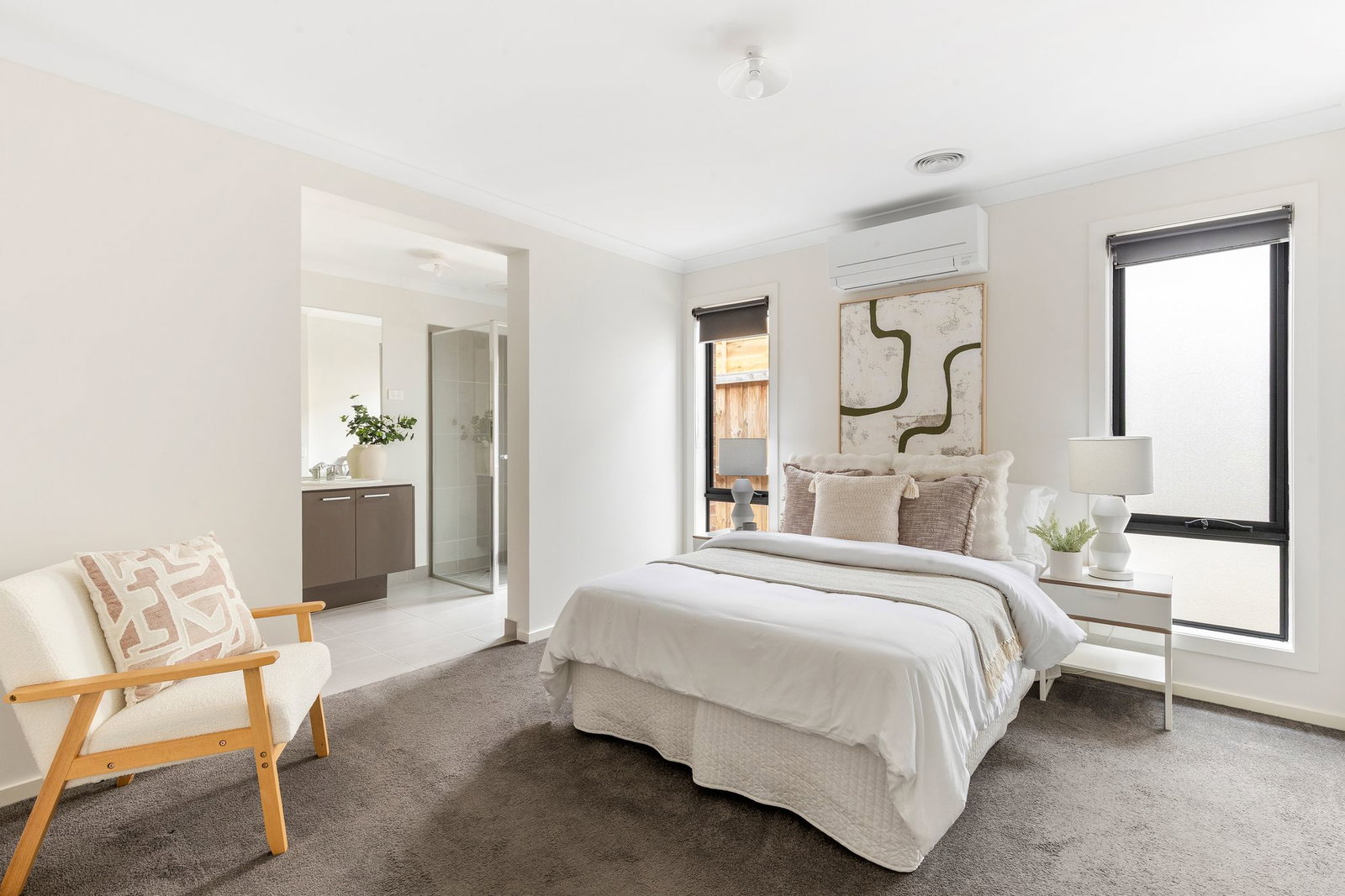 Master Suite: large sized room, large window with roller blinds, ducted heating, split system cooling, carpet flooring, ample sized walk in wardrobe with shelving