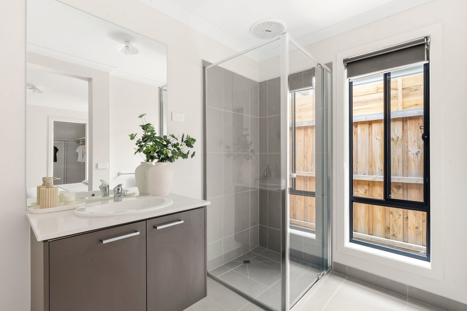 Main bathroom: semi frameless shower, bath, tiles, basin and vanity with storage, stone benchtop, tile and mirror splashback, window with roller blind, seperate toilet