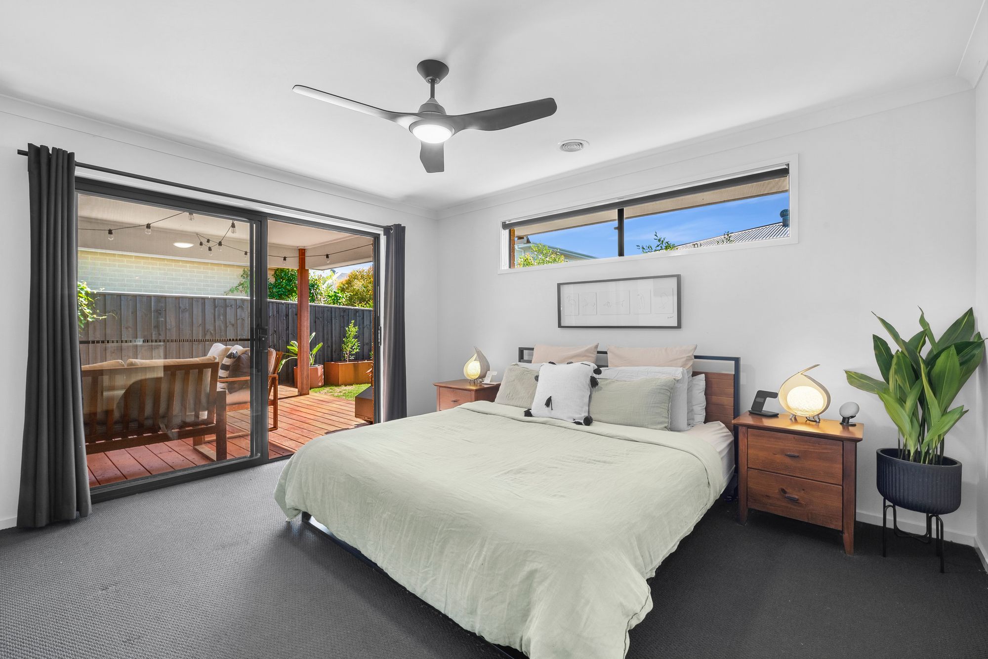 – A master bedroom at the rear of the home, featuring a ceiling fan, large walk in robe and ensuite, sliding door directly out onto the outdoor area
