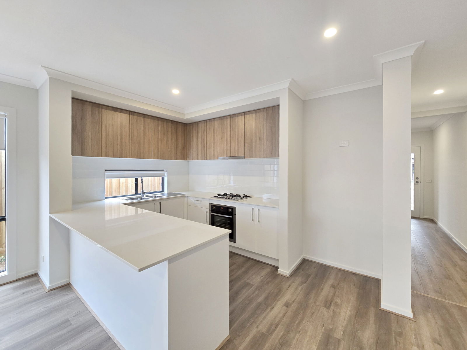 – Kitchen with a window splashback, 4 burner gas cooktop, 600mm electric oven, dishwasher, plenty of cupboards, stone benchtop and a built-in pantry