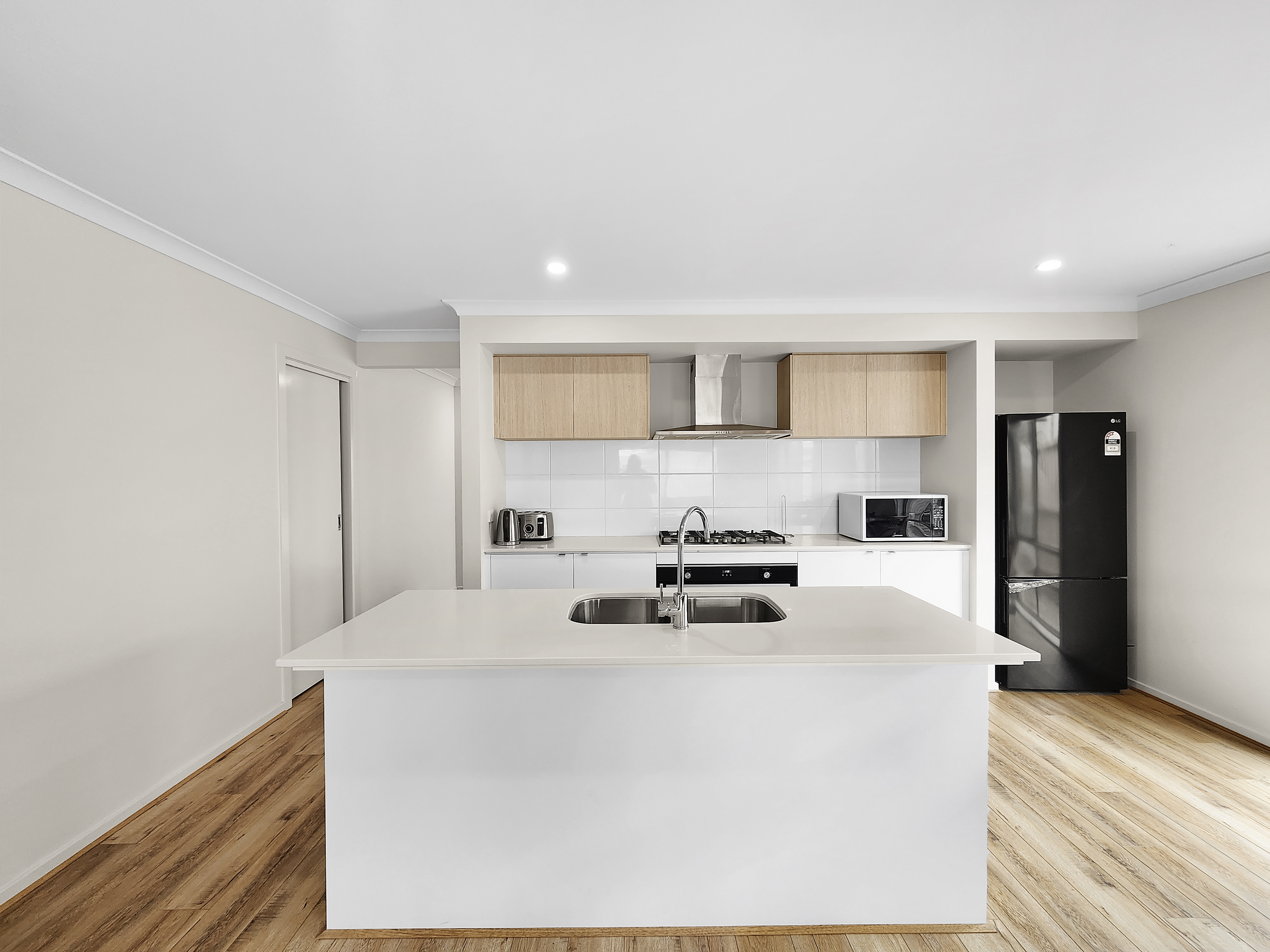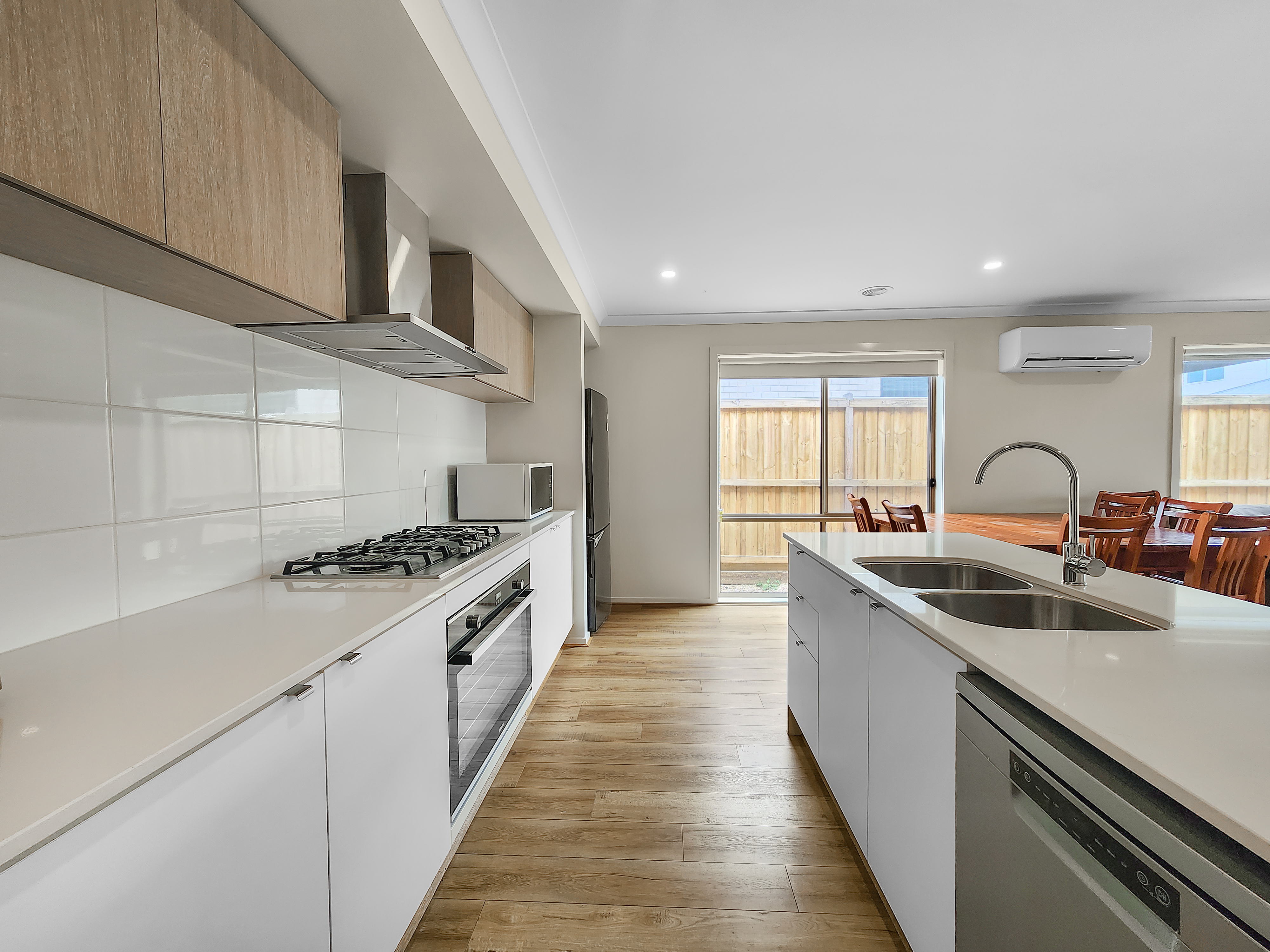 – Kitchen including island bench, 900mm oven, 5 burner gas cooktop, dishwasher, tiled splashback and stone bench tops