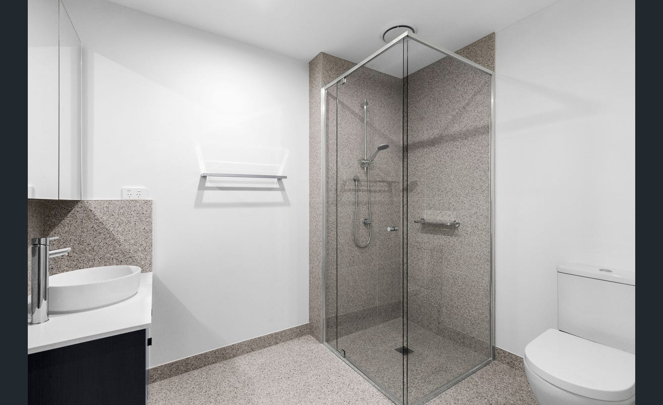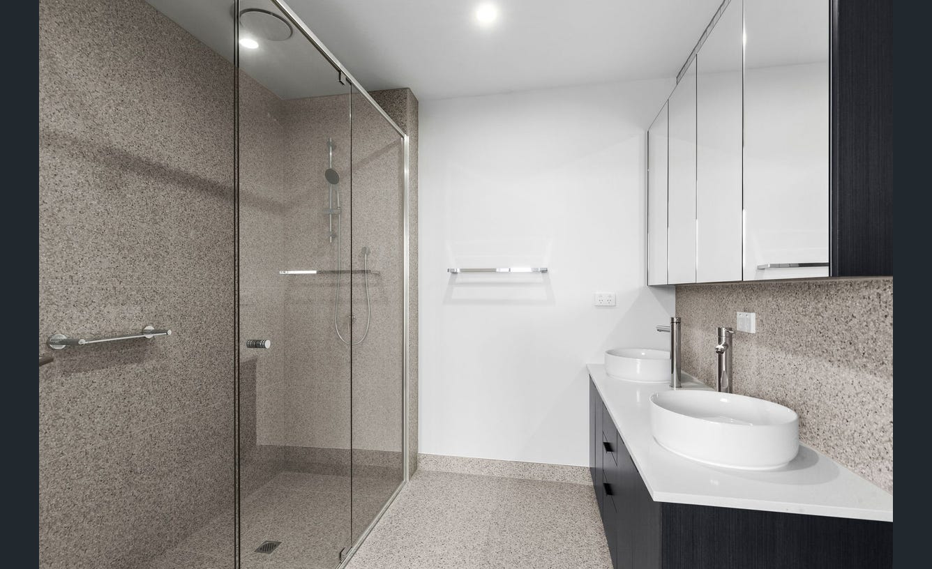 Ensuite: Walk-in spacious shower with handheld shower head, floor-to-ceiling tiles, double vanity with storage, 20mm stone benchtop, mirrored vanity with storage, toilet