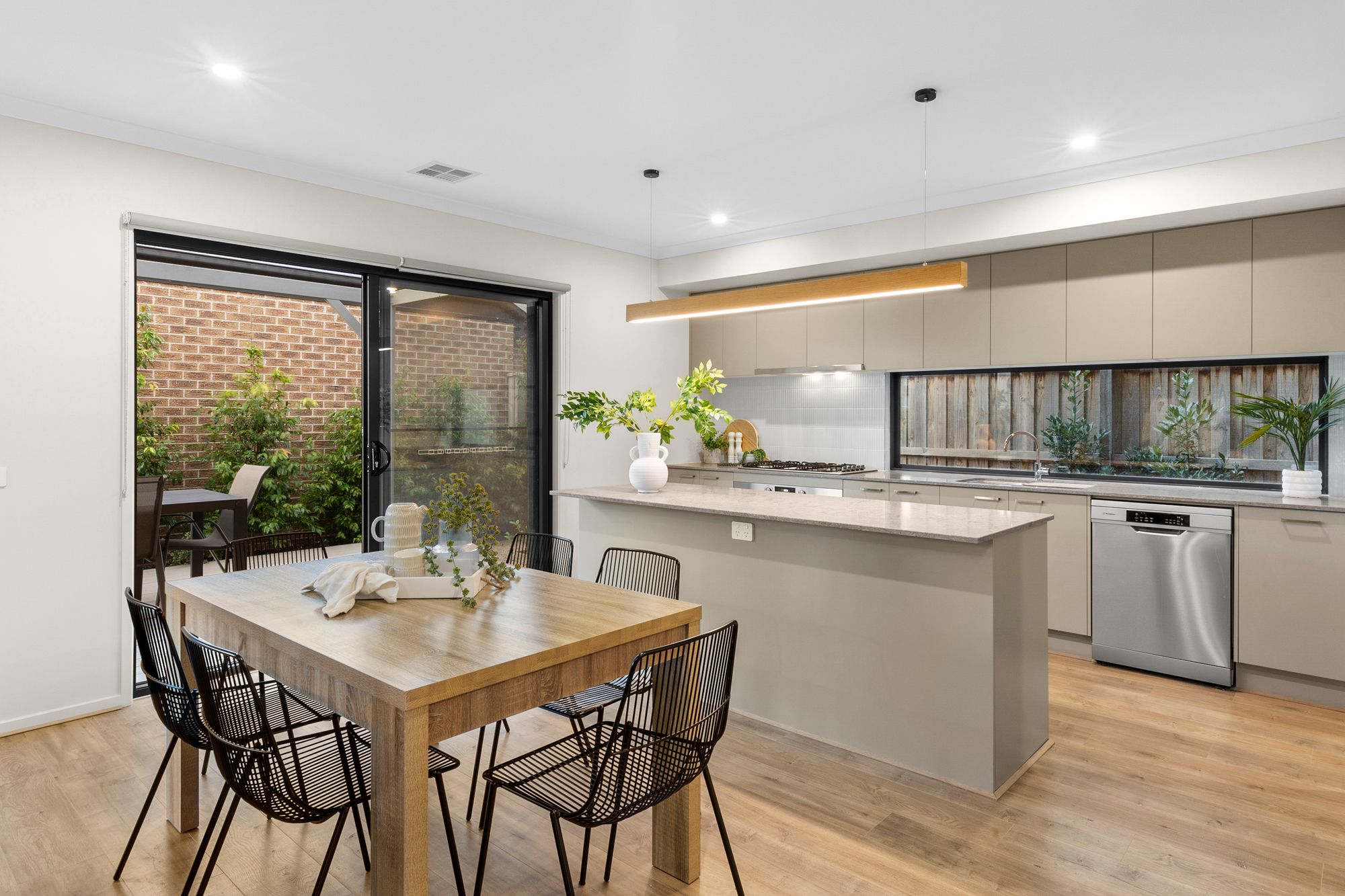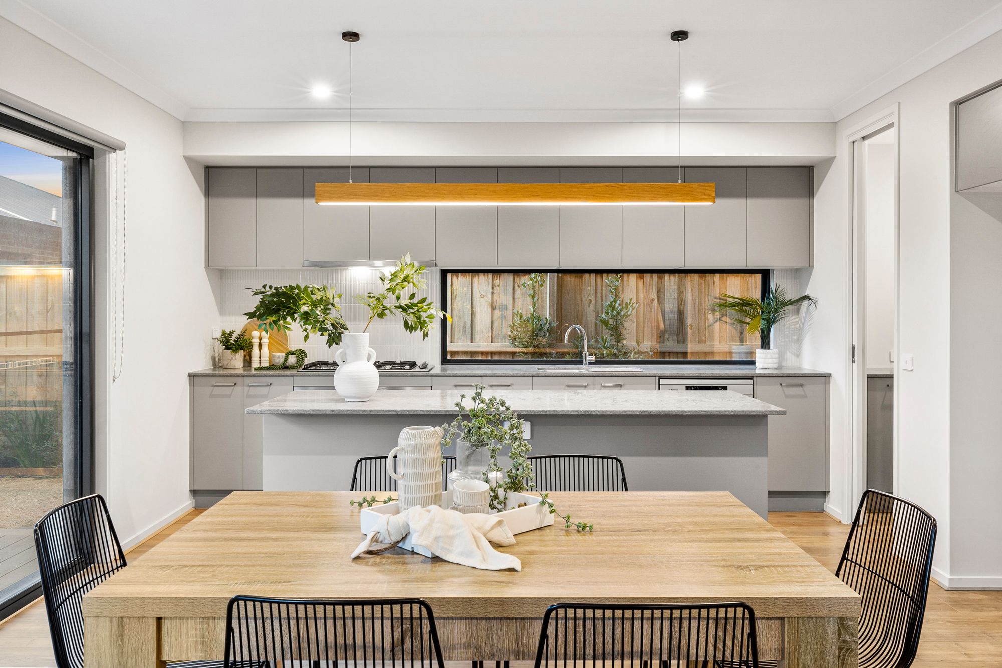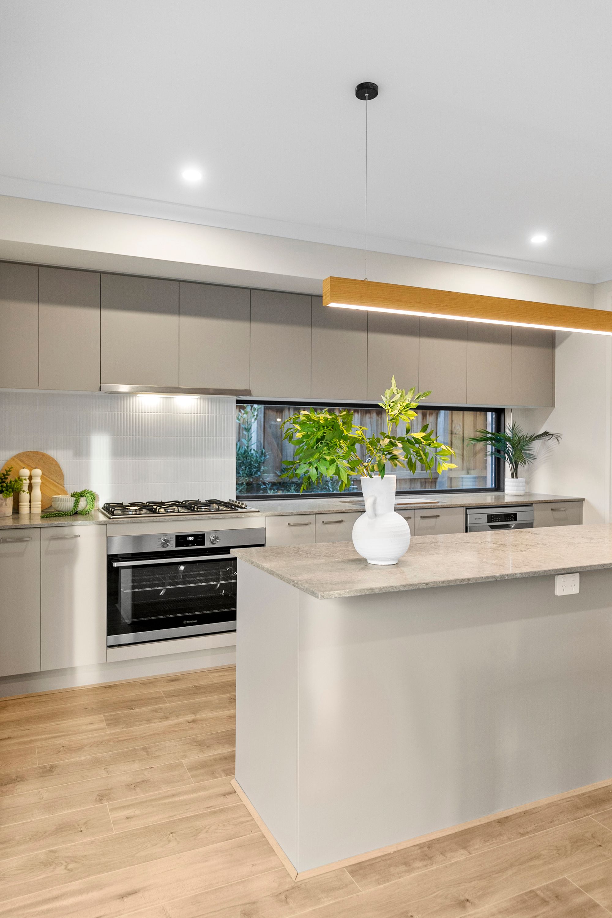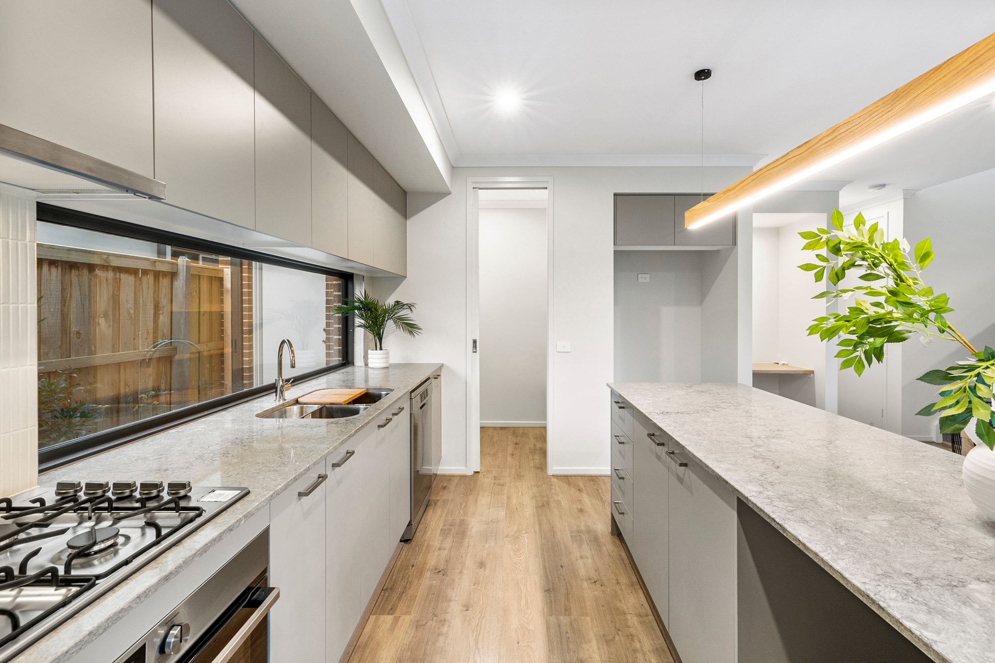 Kitchen- 20mm stone bench tops, island bench, 900mm gas cooktop, oven & rangehood, window splash back, feature tiles, double inset sink, ample overhead storage, downlights, feature wooden pendant bar light, butlers pantry, timber laminate flooring, high ceilings.