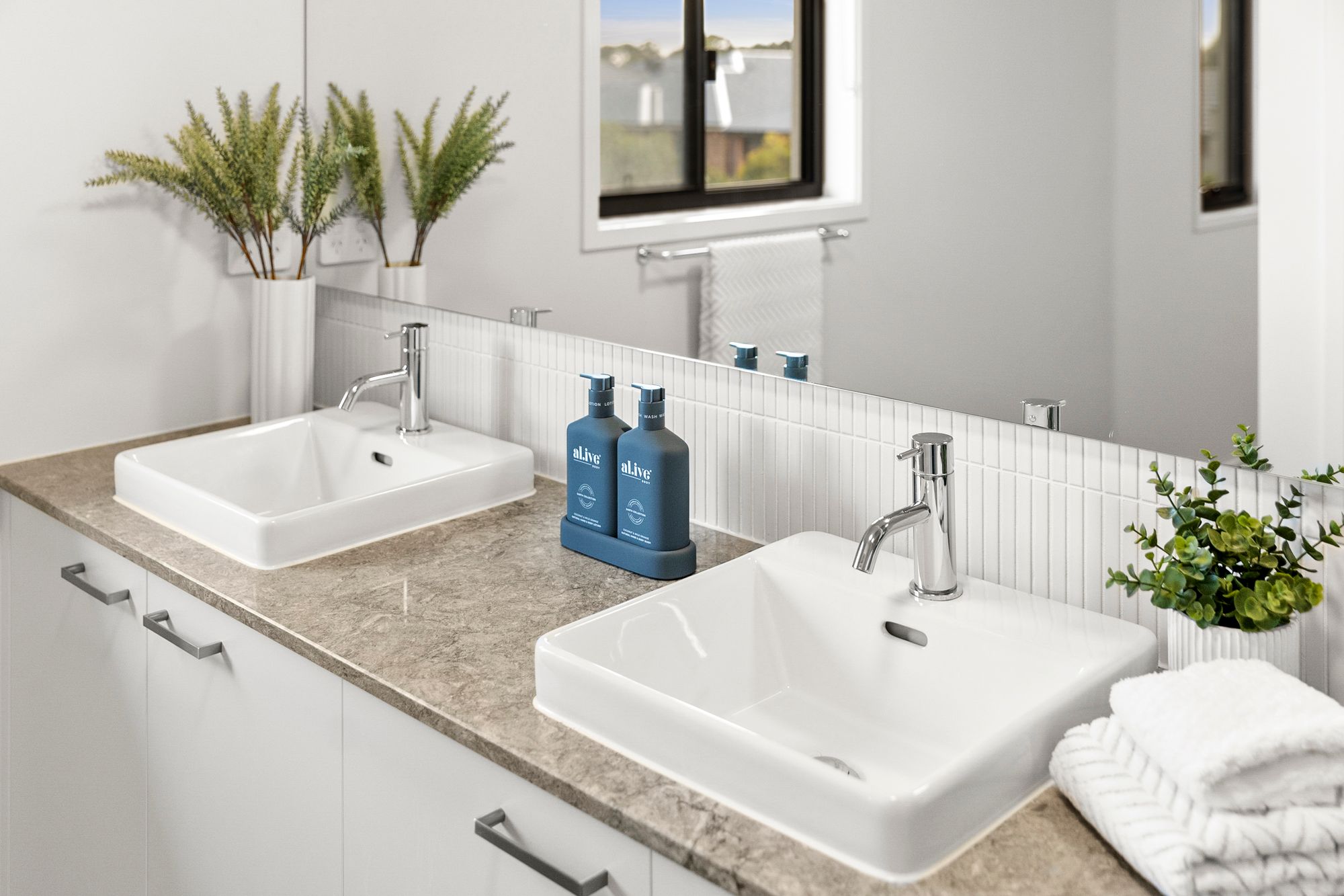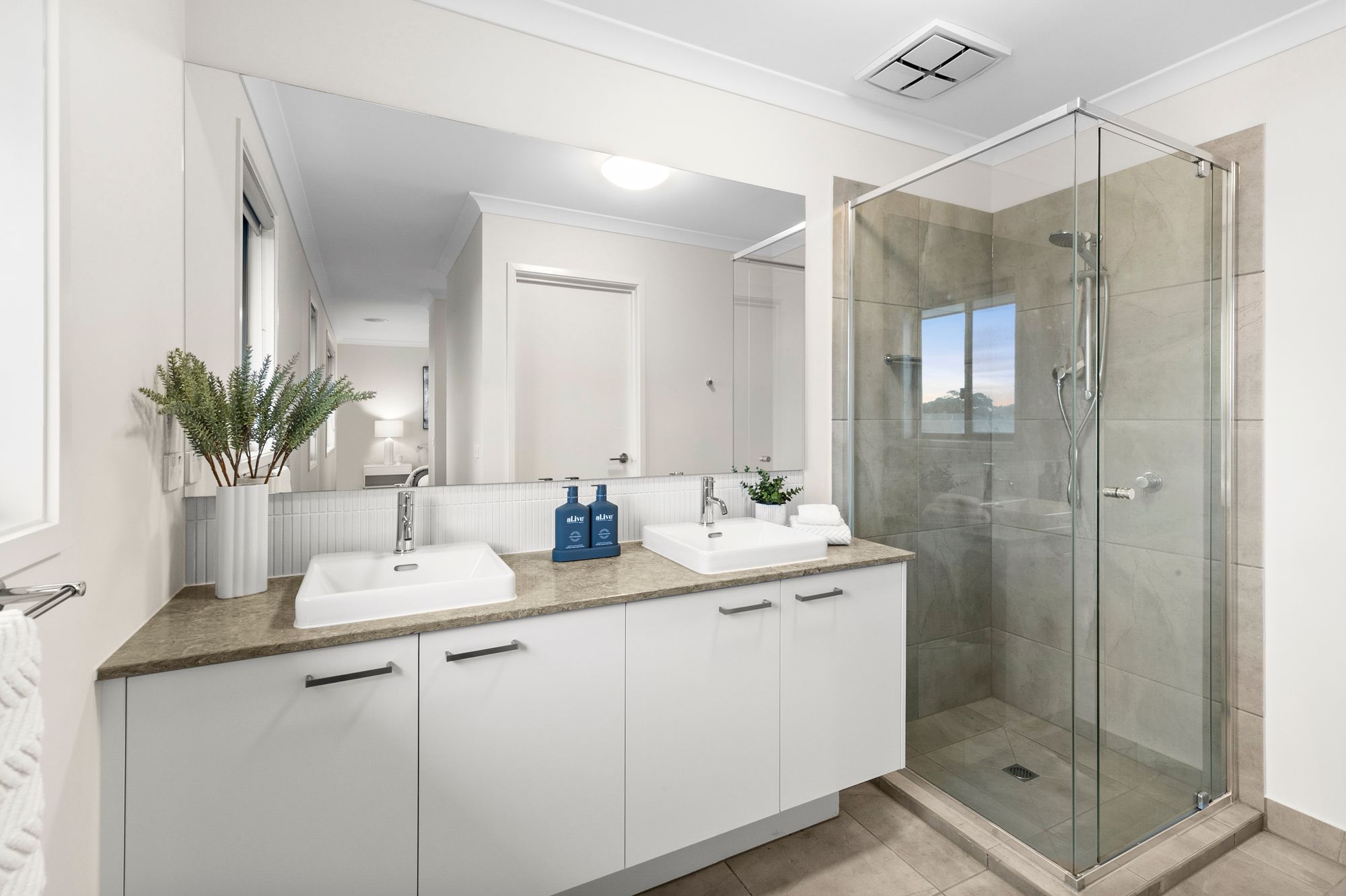 Ensuite with twin basin and extended vanity with ample storage, large mirror, feature tile splashback, tiled shower & toilet