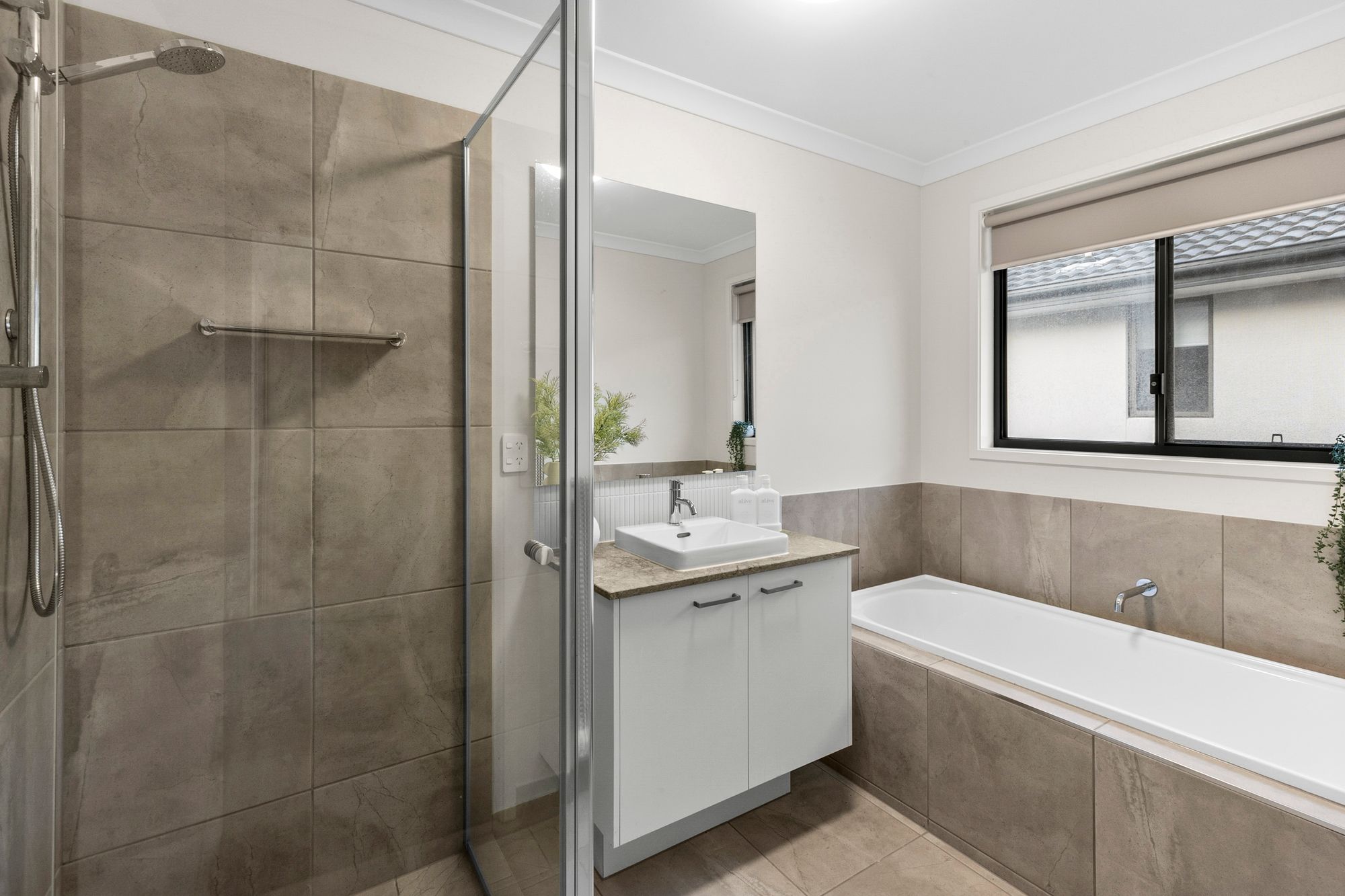 Bathroom- single basin and vanity, feature tile splashback, bath, tiled shower & separate toilet