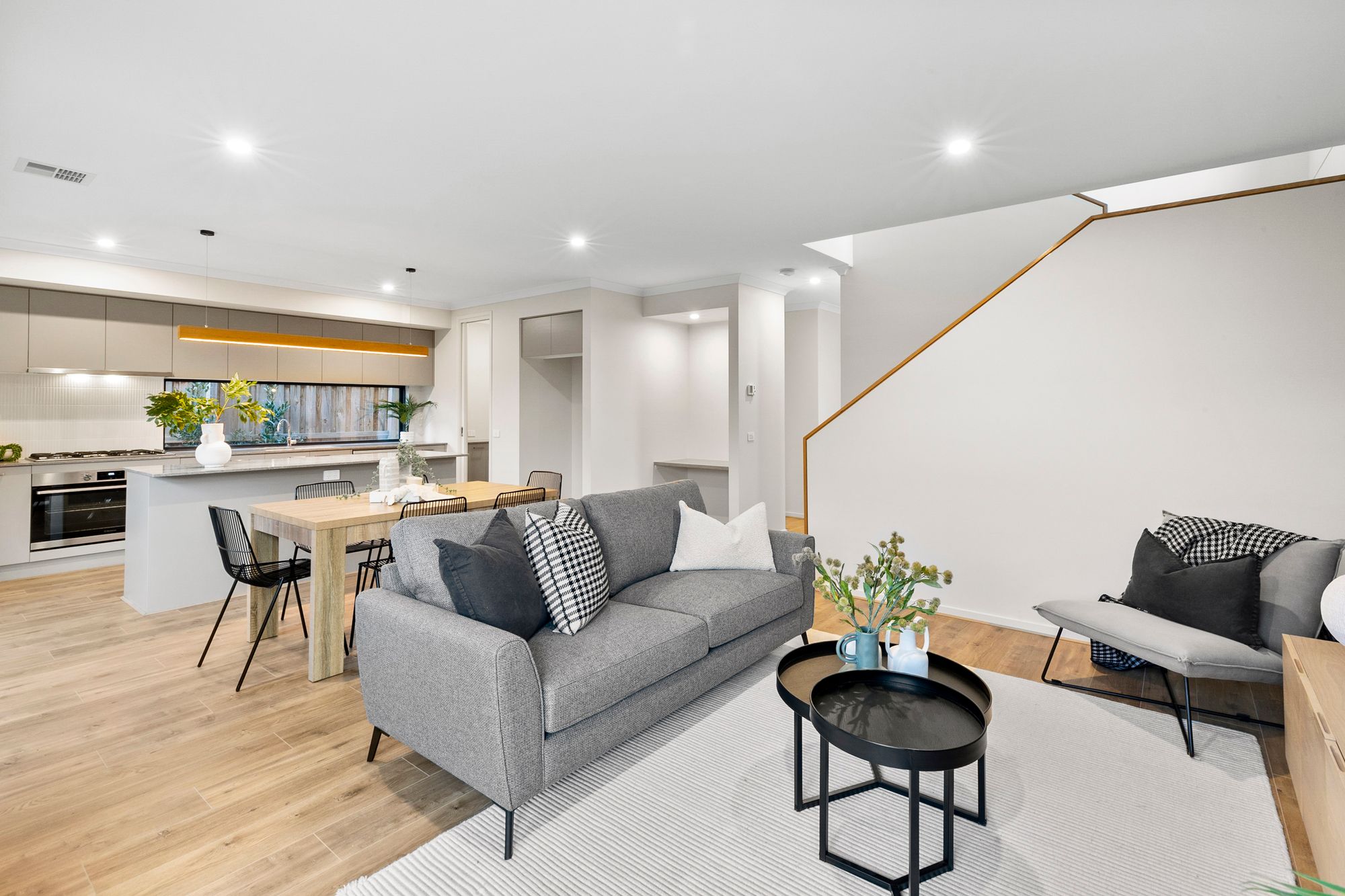 Living- Open plan adjoining kitchen, dining & living, downlights, timber laminate flooring throughout, split system and refrigerative cooling & ducted heating, filled with natural light, sliding doors through to the decked outdoor area, tv data points, high ceilings