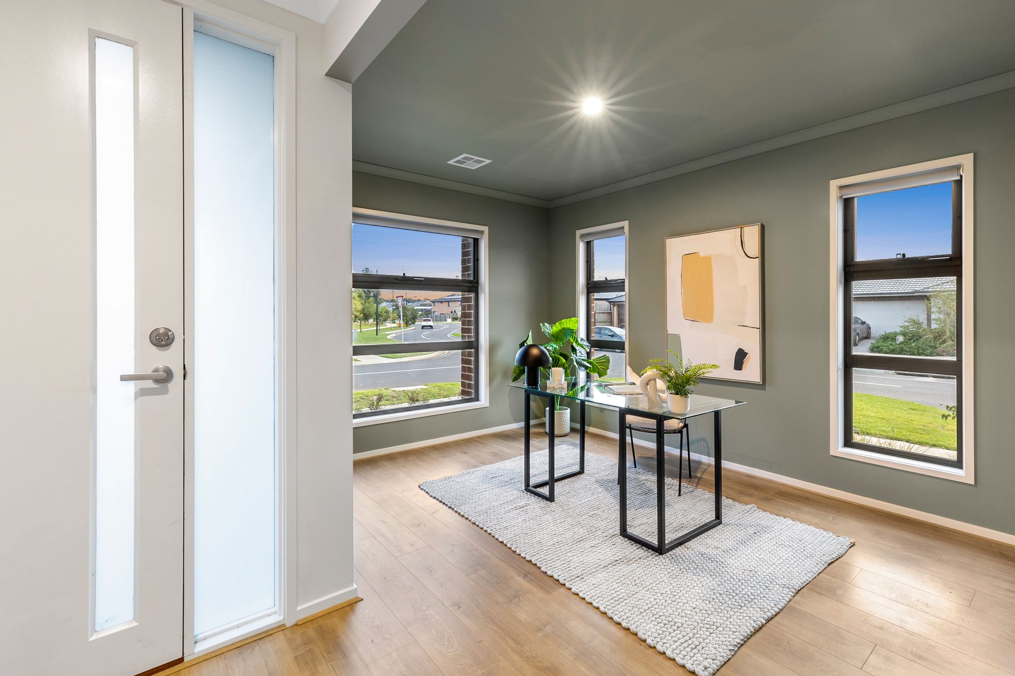 Study – located upon entry, timber laminate flooring, windows with roller blinds, high ceilings, downlights, street level park views, ducted heating.