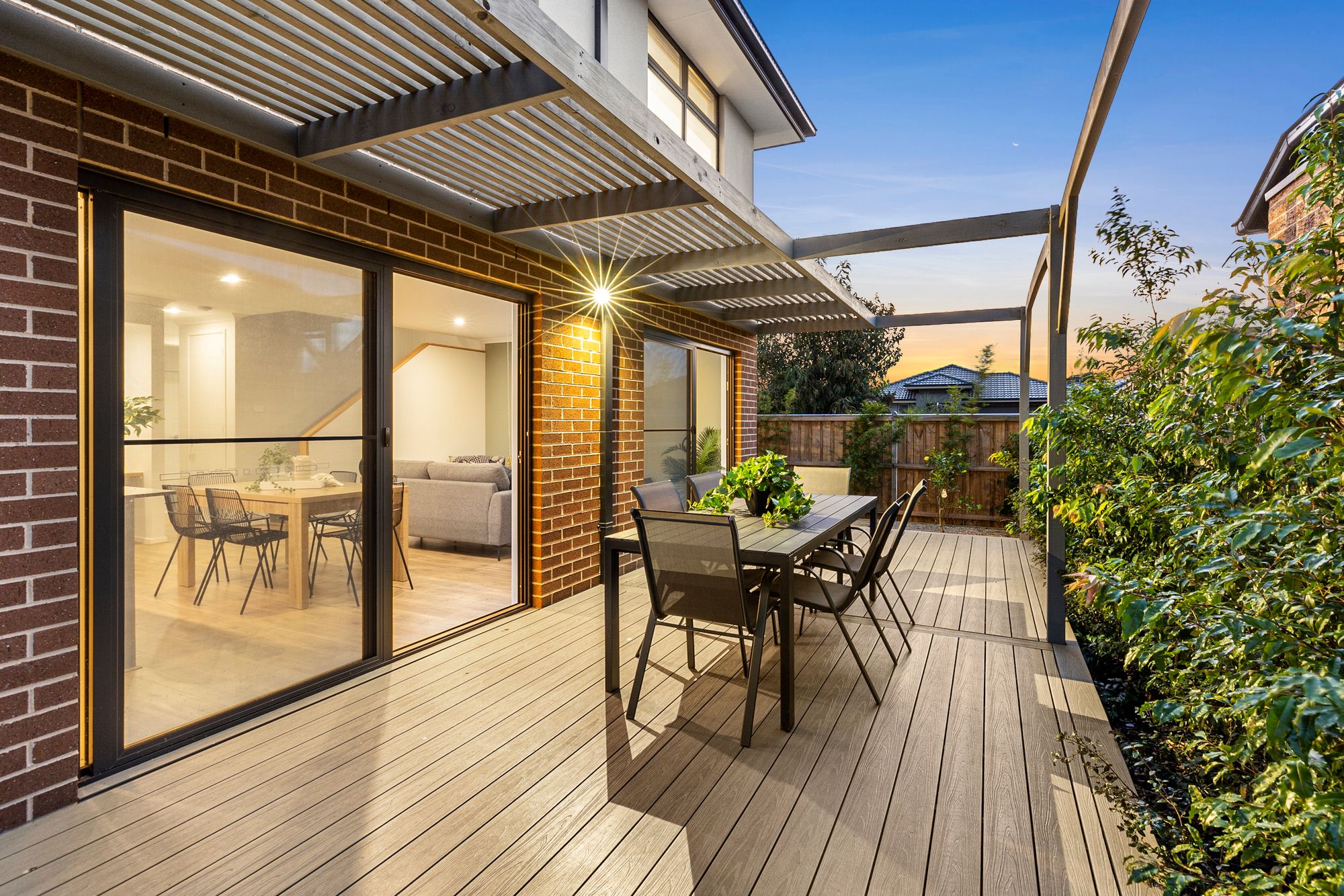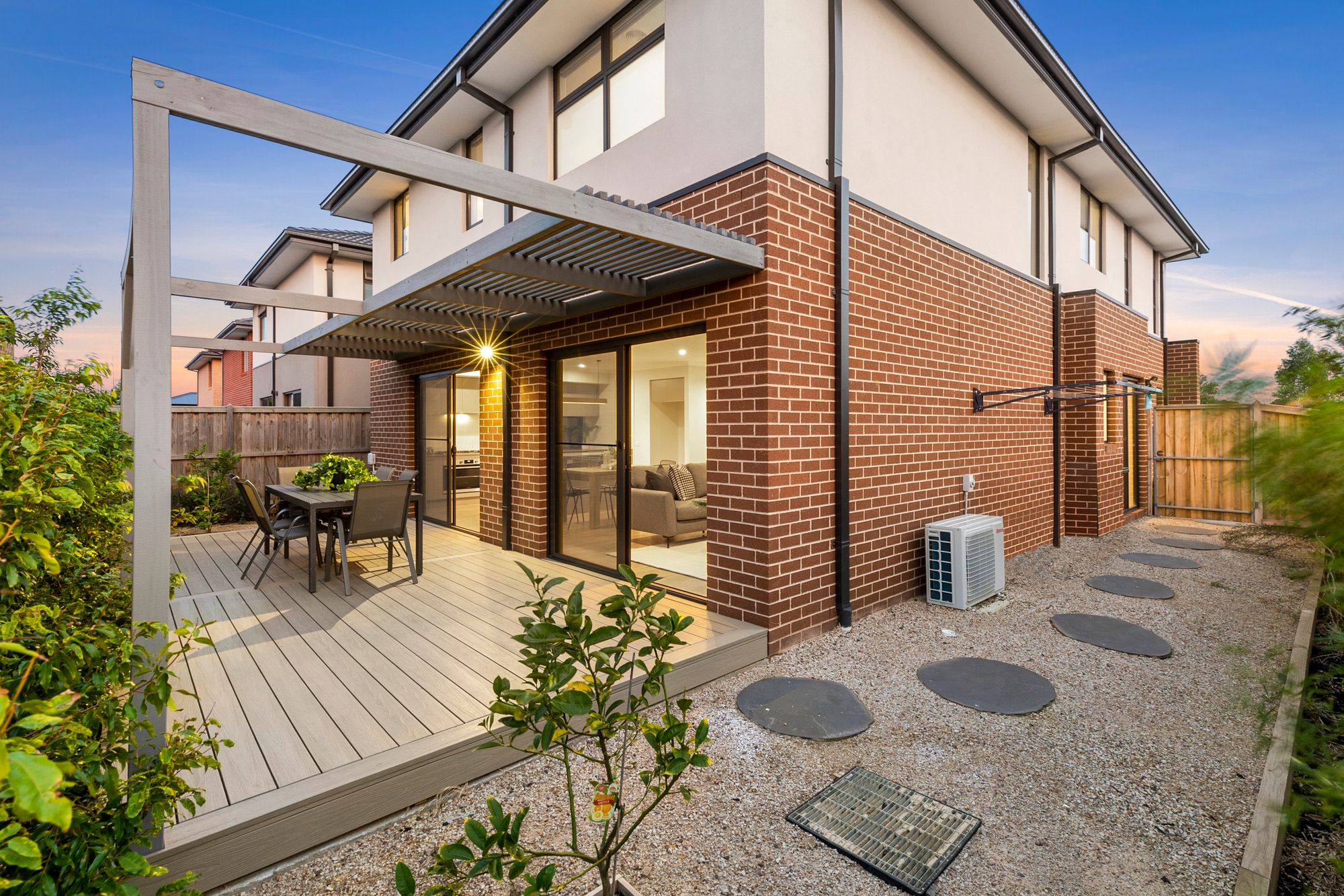 Outdoor- North facing decked area, irrigated low maintenance landscaping, side single gate access through to yard, garden beds.