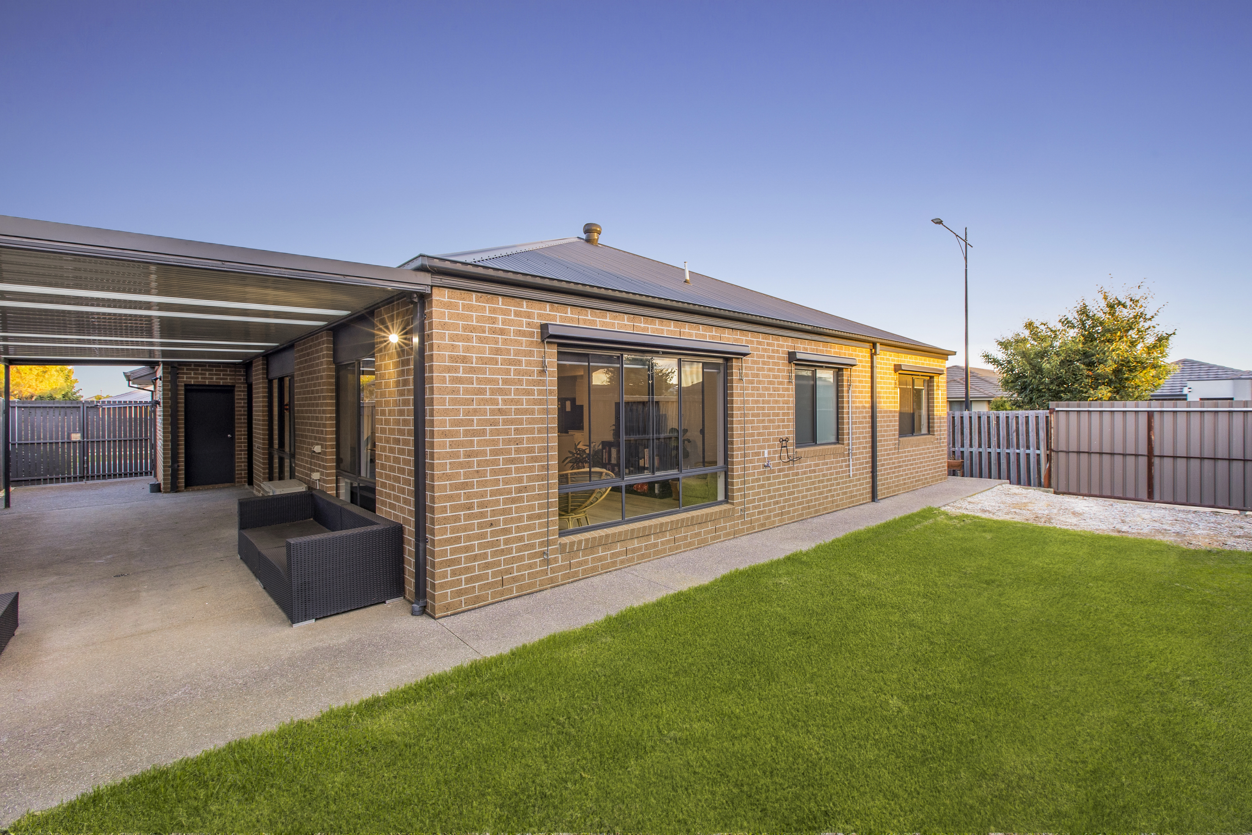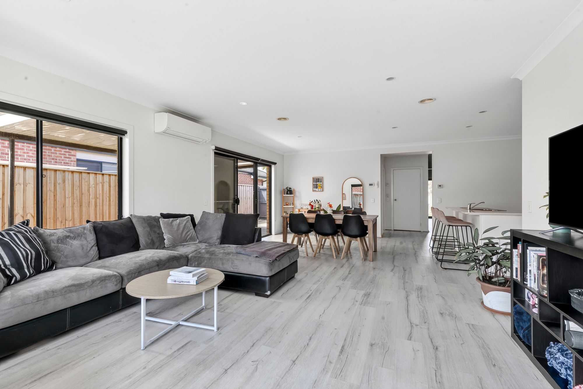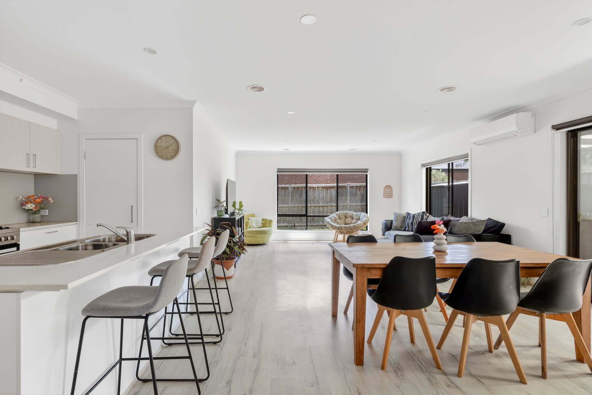 Bathed in natural light through expansive surrounding windows, the main living and dining zone creates a bright and welcoming atmosphere. High ceilings, timber-look flooring, ducted heating, split system and downlights enhance the modern feel, while roller blinds provide privacy when needed. Glass sliding doors extend the space outdoors to an undercover pergola and exposed aggregate entertaining area, ideal for hosting family and friends all year-round.