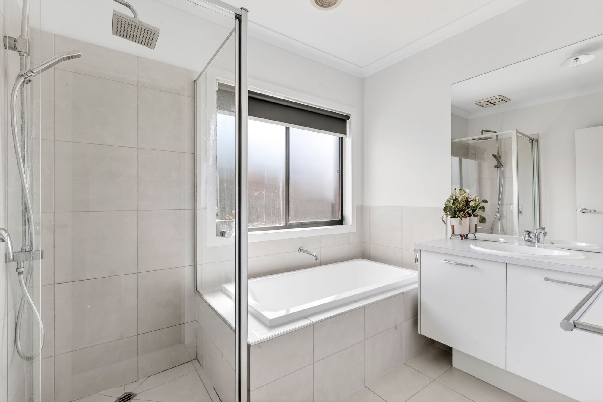 The contemporary family bathroom is thoughtfully designed with a single vanity and ample cabinetry, tiled and mirrored splashback, bath and a separate shower with quality fittings. A separate toilet enhances convenience for busy households.