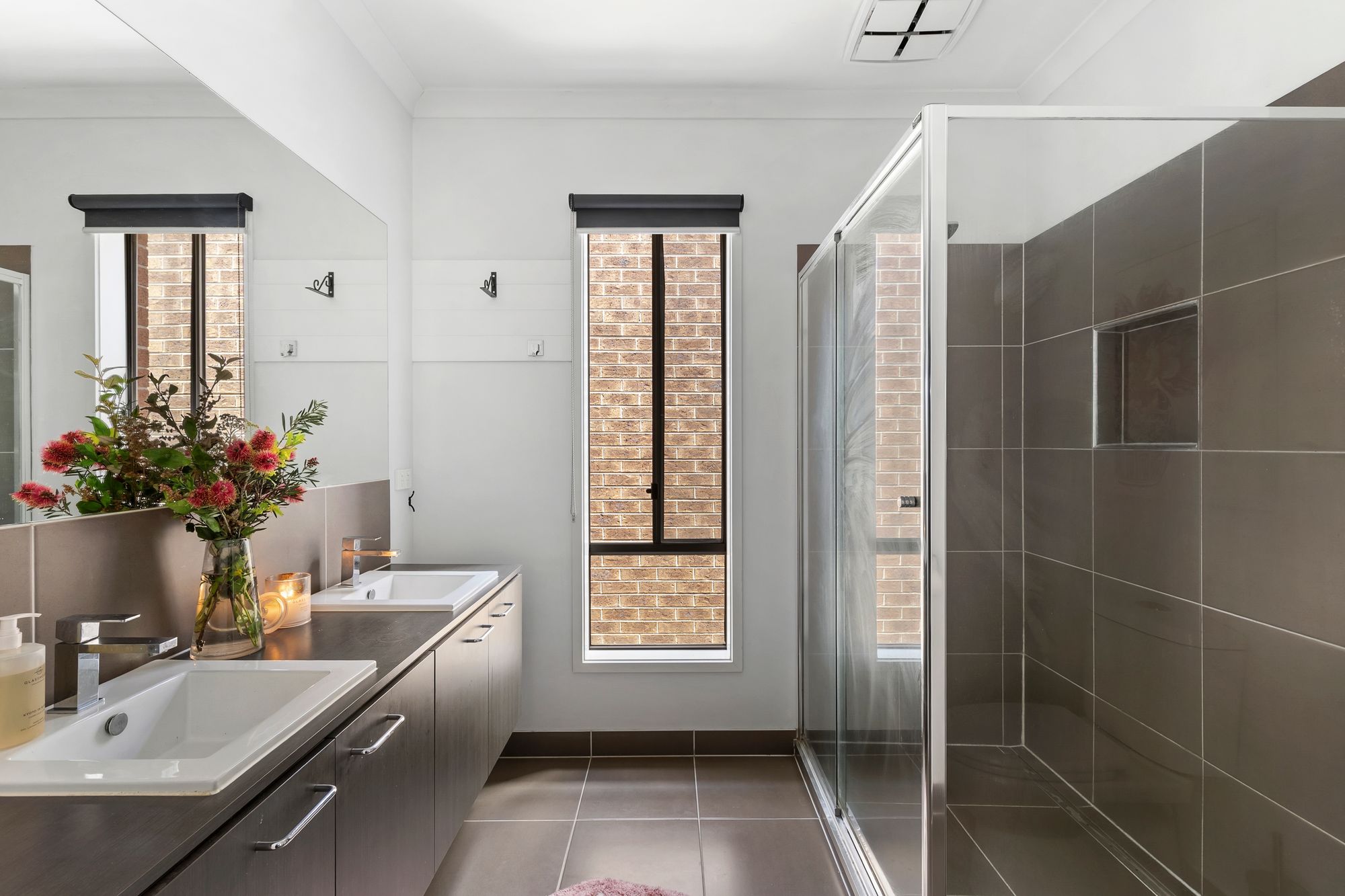 Ensuite: His/hers vanity, frameless mirror, storage, upgraded shower with niche, windows with roller blinds, tile flooring, toilet