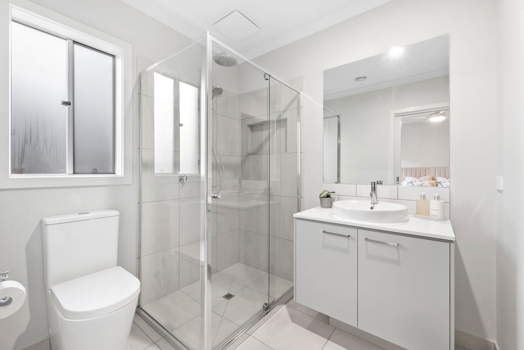 Ensuite: Mirror splash back, Stone vanity with storage, counter top basin with chrome tapware, frosted window for privacy, semi framless shower with rain shower head & hand held shower head, shower niche, toilet.
