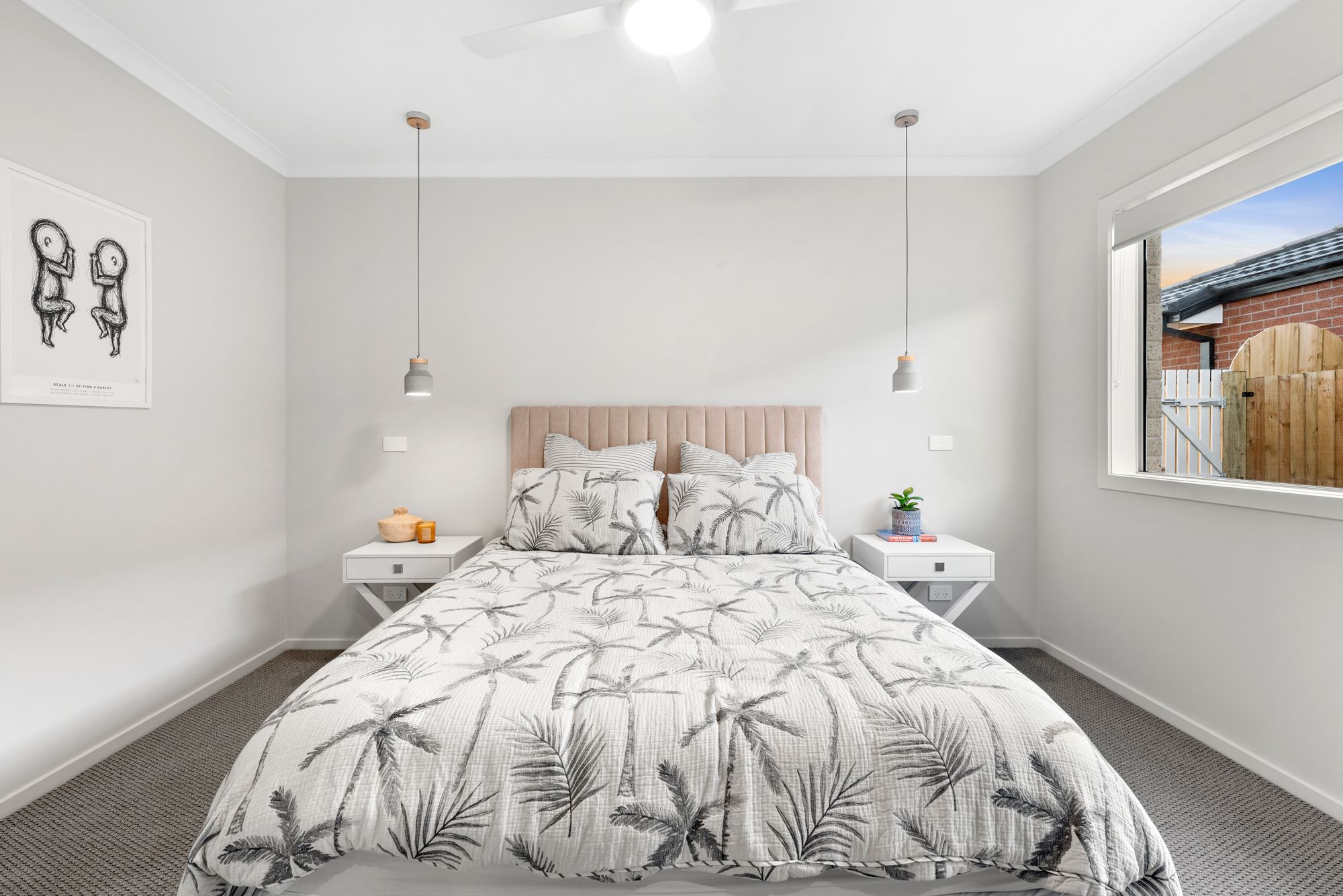 Master Suite- Pendant lights, ceiling fan with light, windows with roller blinds, ducted heating, walk in robe,