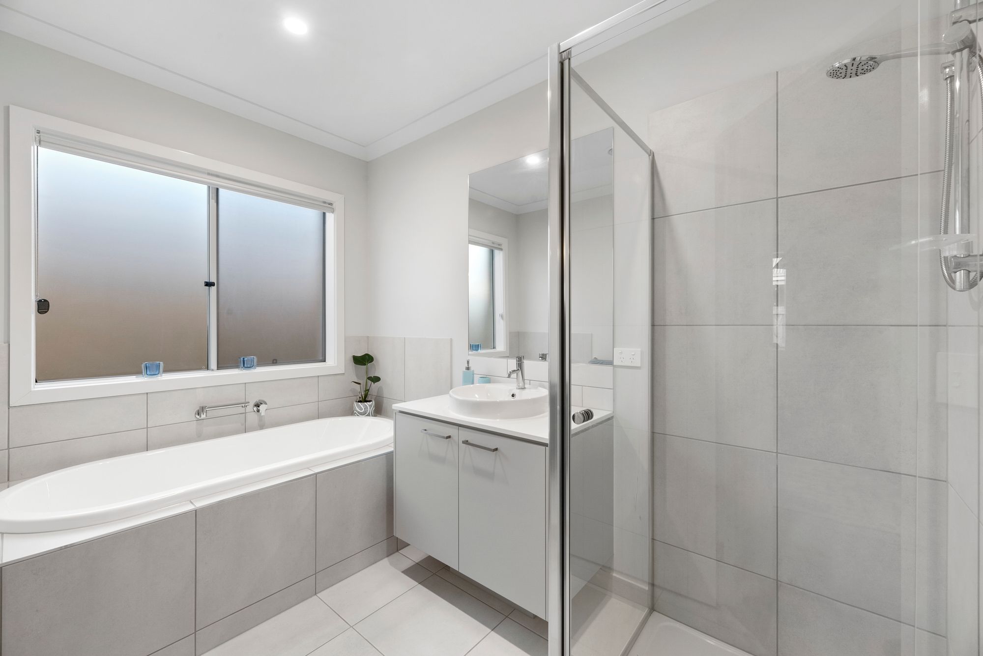 Main bathroom- Stone vanity, single countertop basin, chrome tapware, mirror splashback, bath, semi framless shower, hand- held & ceiling rain shower head, separate toilet