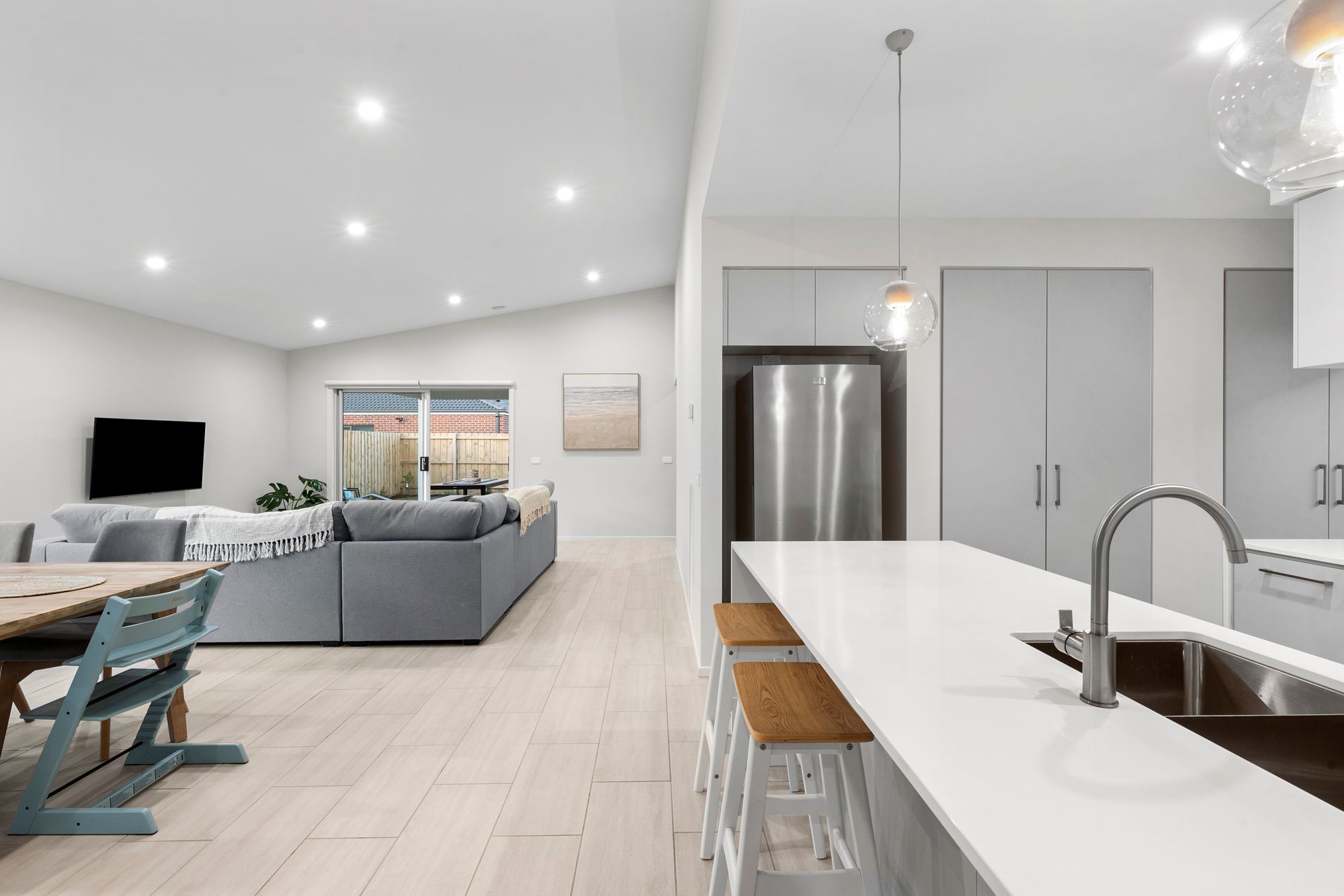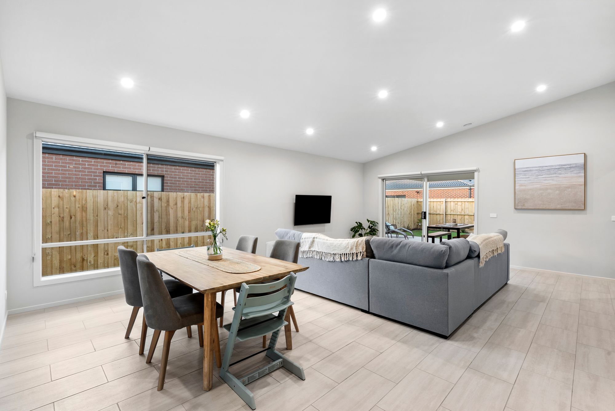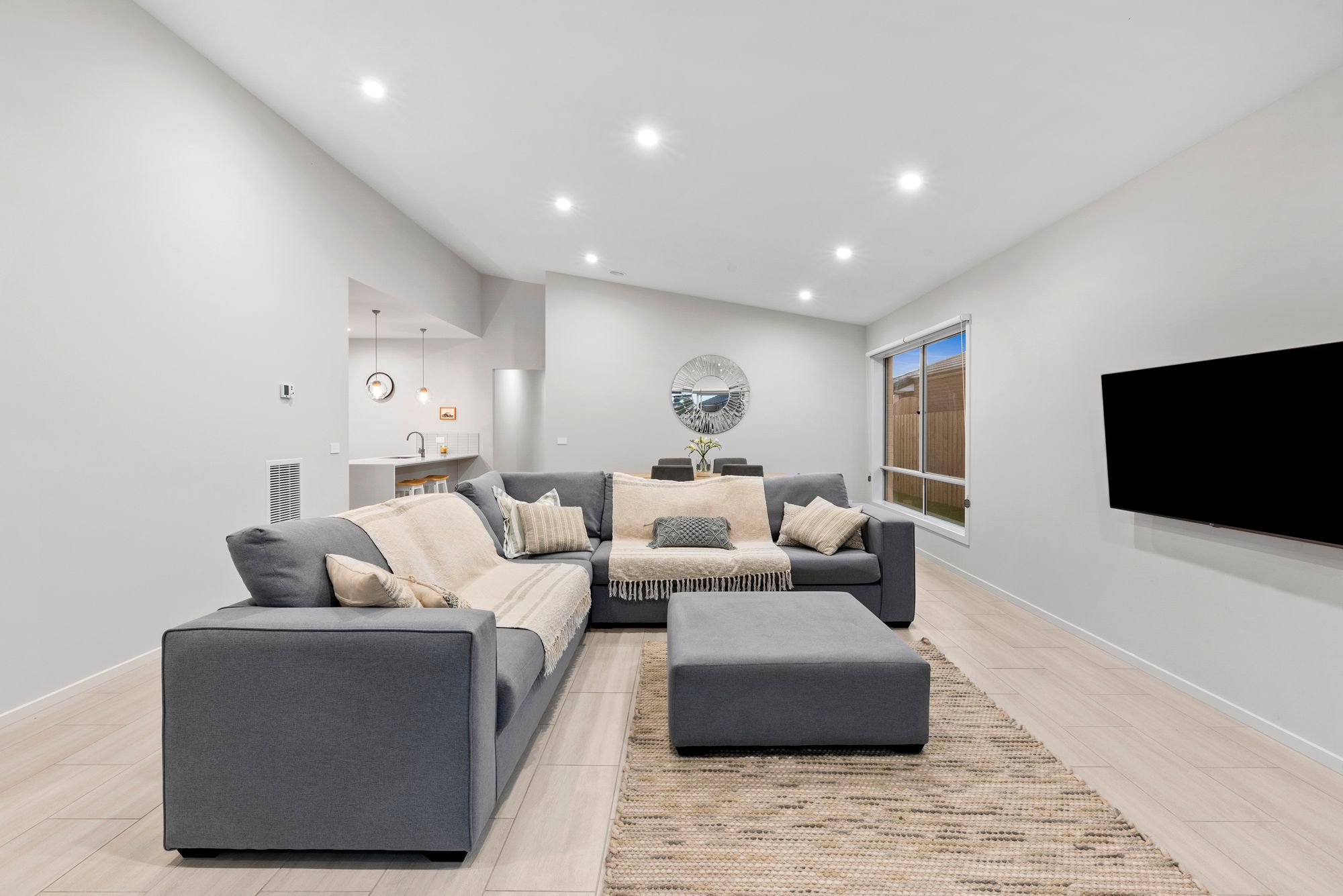 Open plan living- North facing, open plan kitchen/ living/ dining, raked ceiling, down lights, square set cornice’s, windows with roller blinds, tile flooring, glass sliding doors to alfresco creating an indoor/outdoor flow, tv brackets and data points.