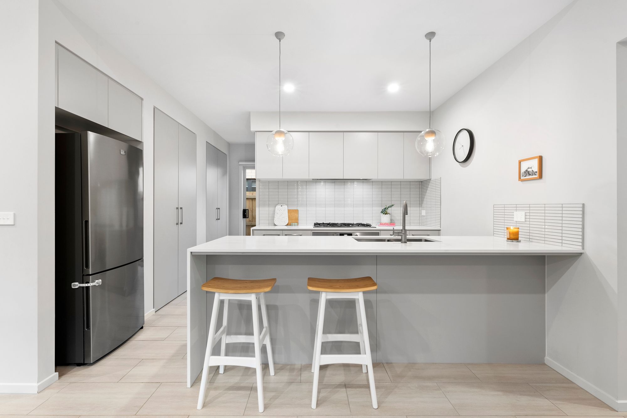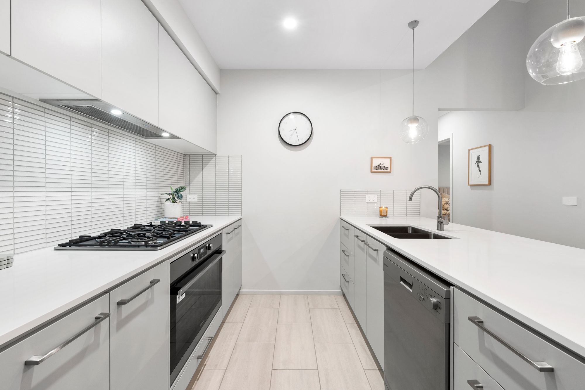 Kitchen- Feature tile flooring, 900mm stainless steel appliances including gas cooktop, oven, concealed range hood & dishwasher, dual undermount sink, chrome tapware, kit kat tile splashback, pot drawer cabinetry, island bench waterfall feature, additional power points, over head storage, downlights and pendant lighting, built in pantry.
