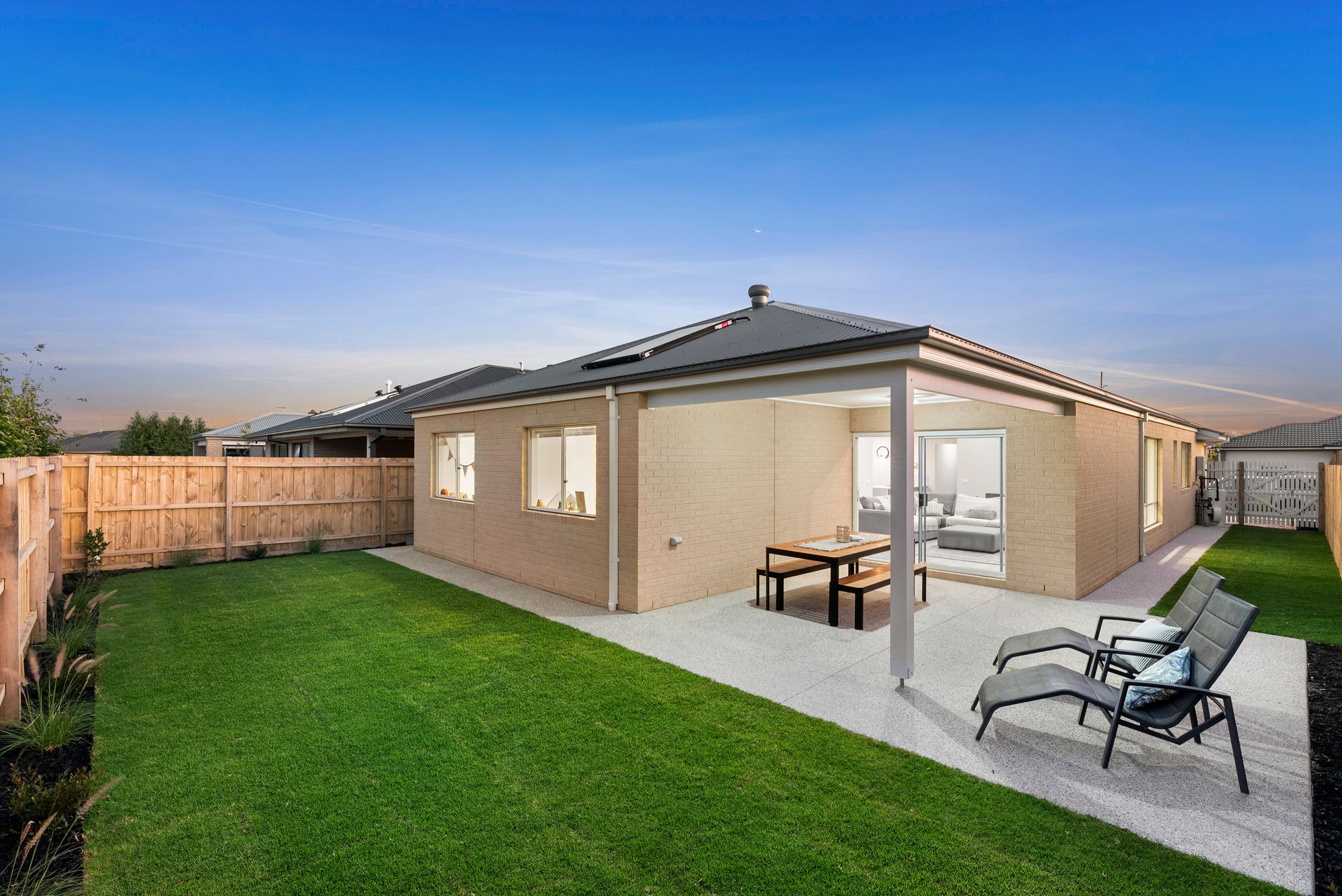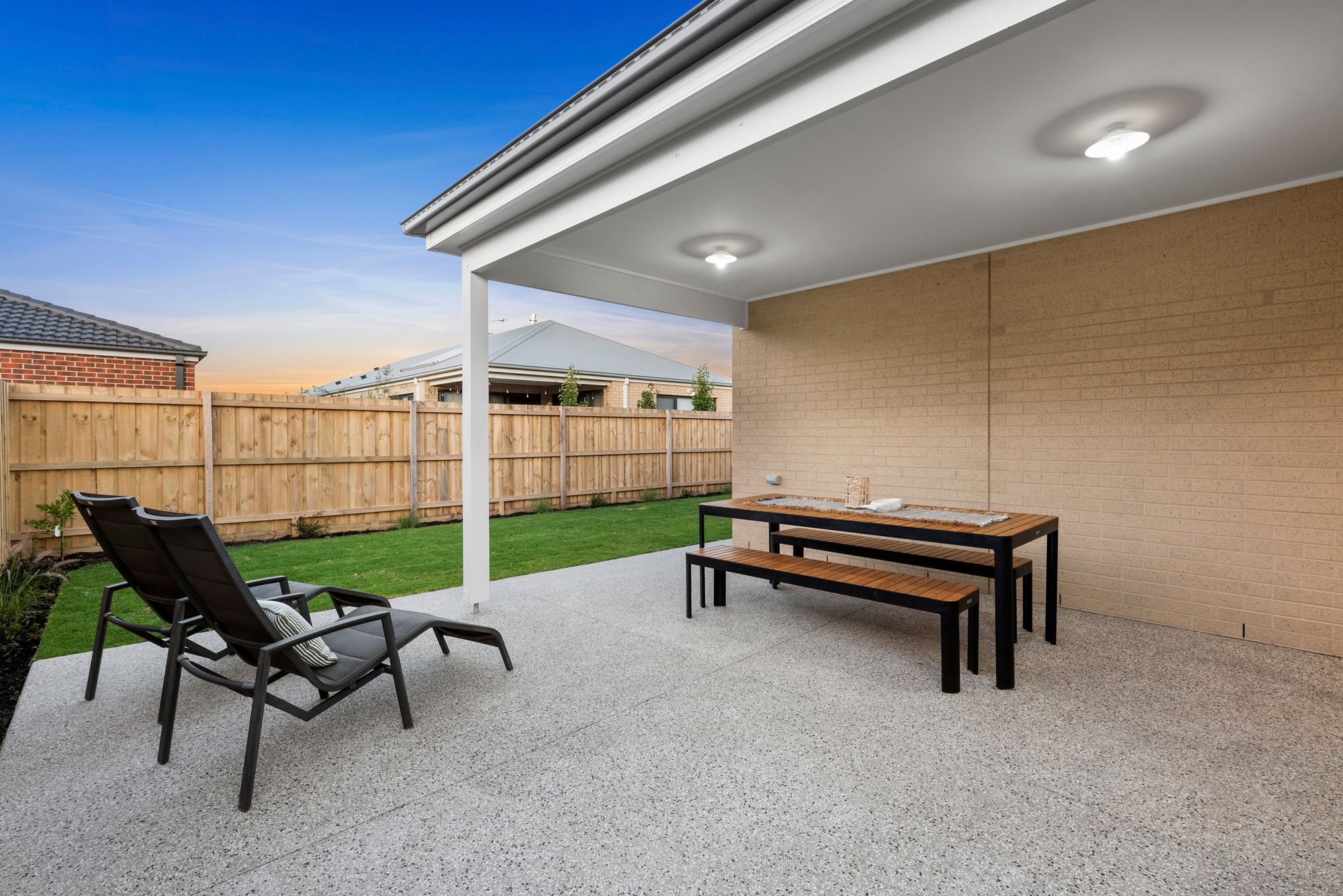 Outdoor- Undercover alfresco with exposed aggregate concrete, down lights and ceiling fan, professionally landscaped, space for pets or kids, garden beds, side access, well maintained front yard.