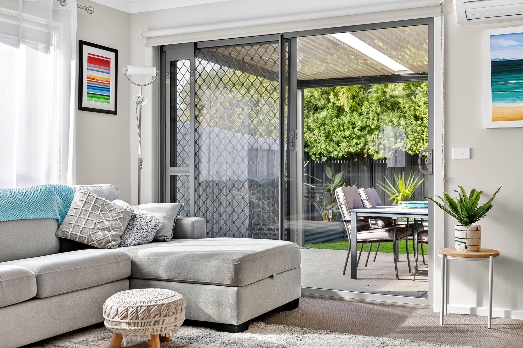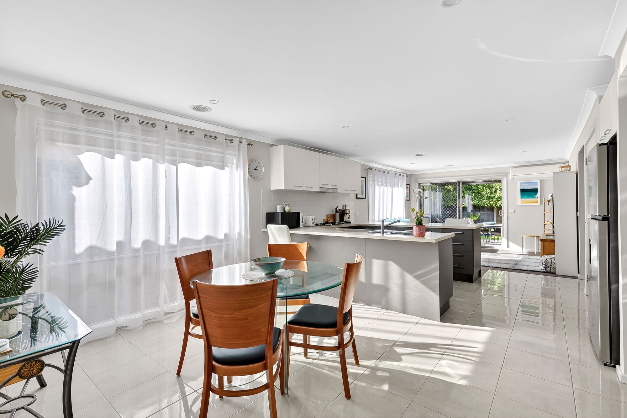 Living/Dining: Open plan kitchen/living/dining zone with tiles through kitchen and dining, soft carpet in the lounge, ducted heating, split system air conditioning, roller blinds & sheer curtains, large windows, glass sliding doors and security door to the rear yard and downlights.