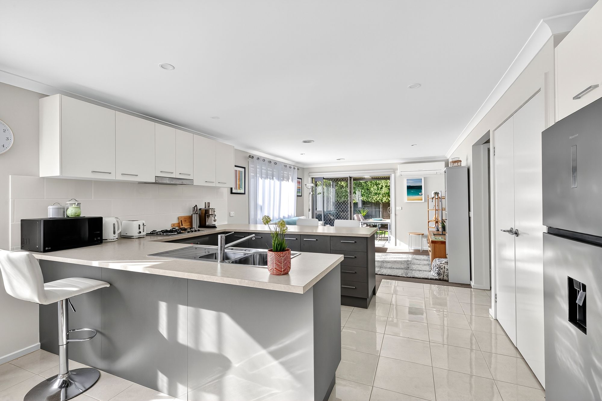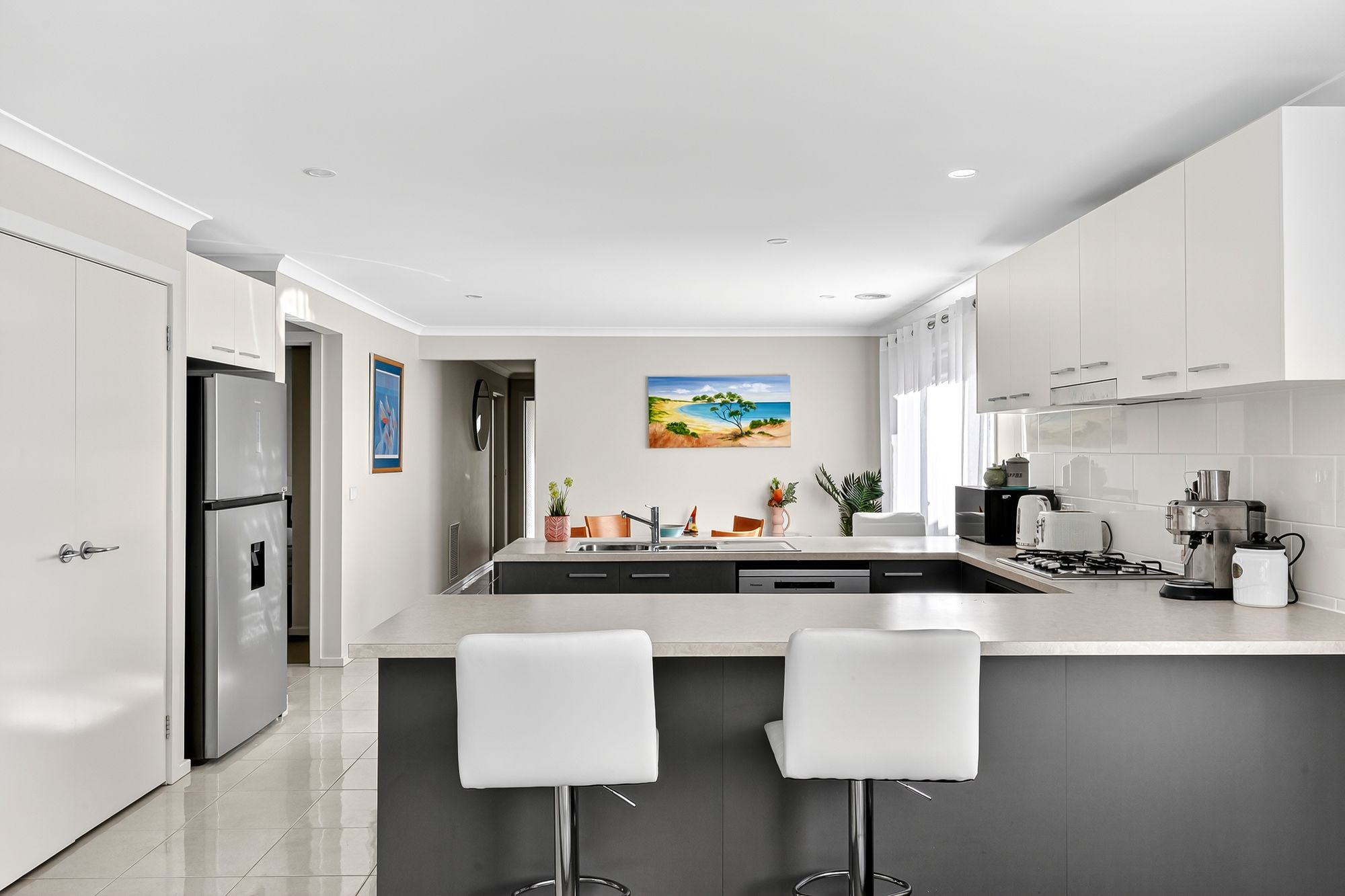 Kitchen: Functional and well-appointed with a peninsula benchtop, 600mm stainless steel appliances, tiled splashback, built-in pantry, overhead cabinetry, chrome tapware, pullout rangehood, downlights, tiled flooring and dishwasher.