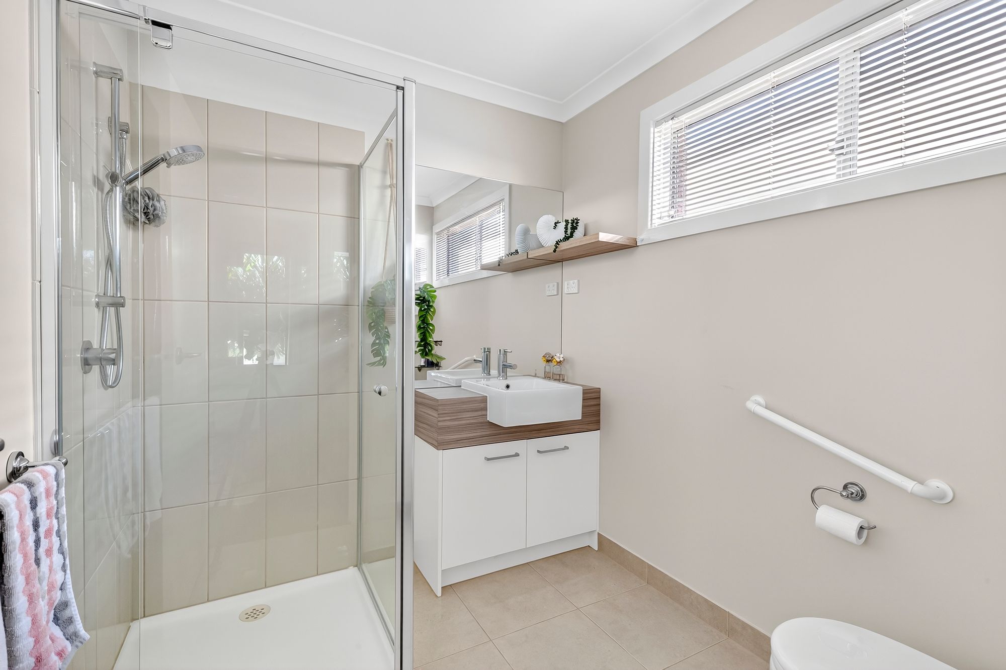 Ensuite: Semi-frameless shower, vanity with mirror splashback, chrome fittings and toilet.