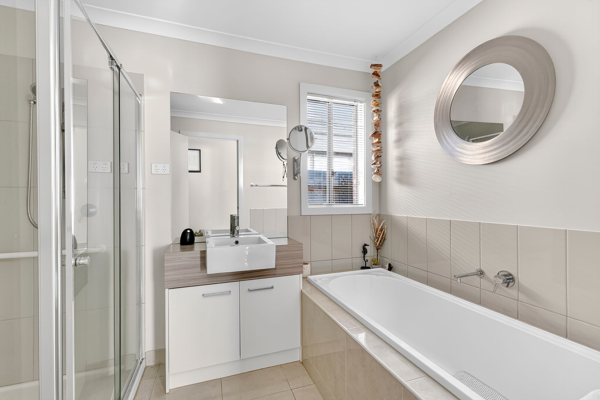 Main Bathroom: Features a semi-frameless shower, bath, vanity with single basin and mirror splashback, chrome fittings, and separate toilet.