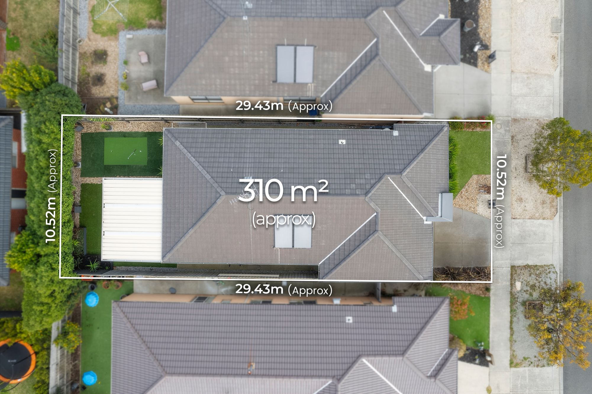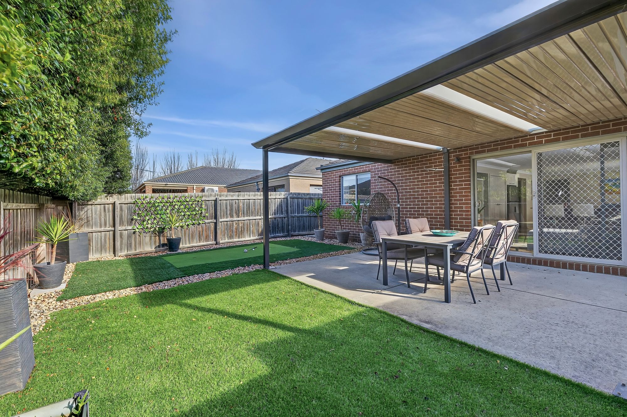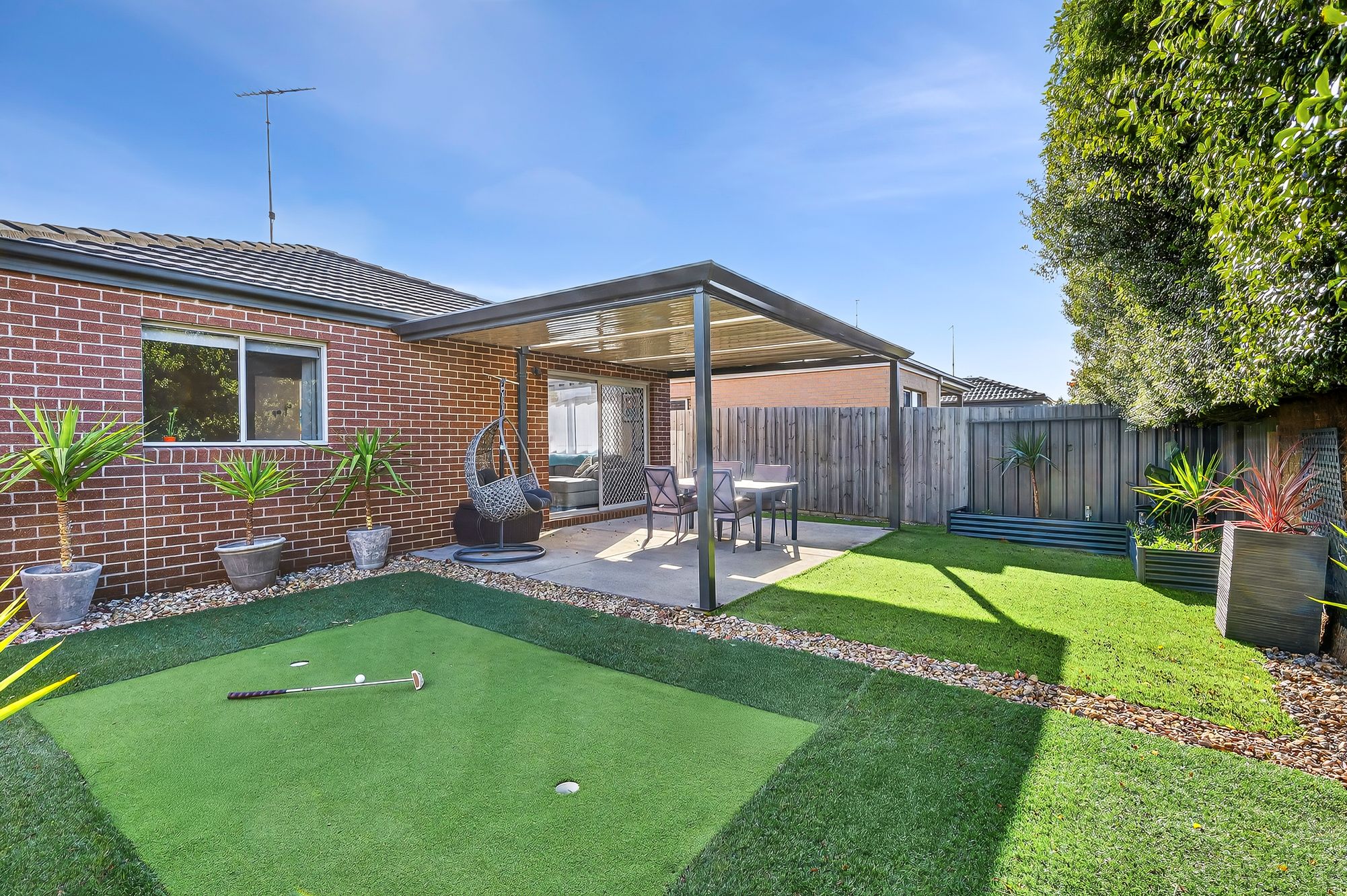 Outdoor: Sun-soaked backyard with established garden beds, grassed area, putting green and concreted patio, perfect for outdoor entertaining.