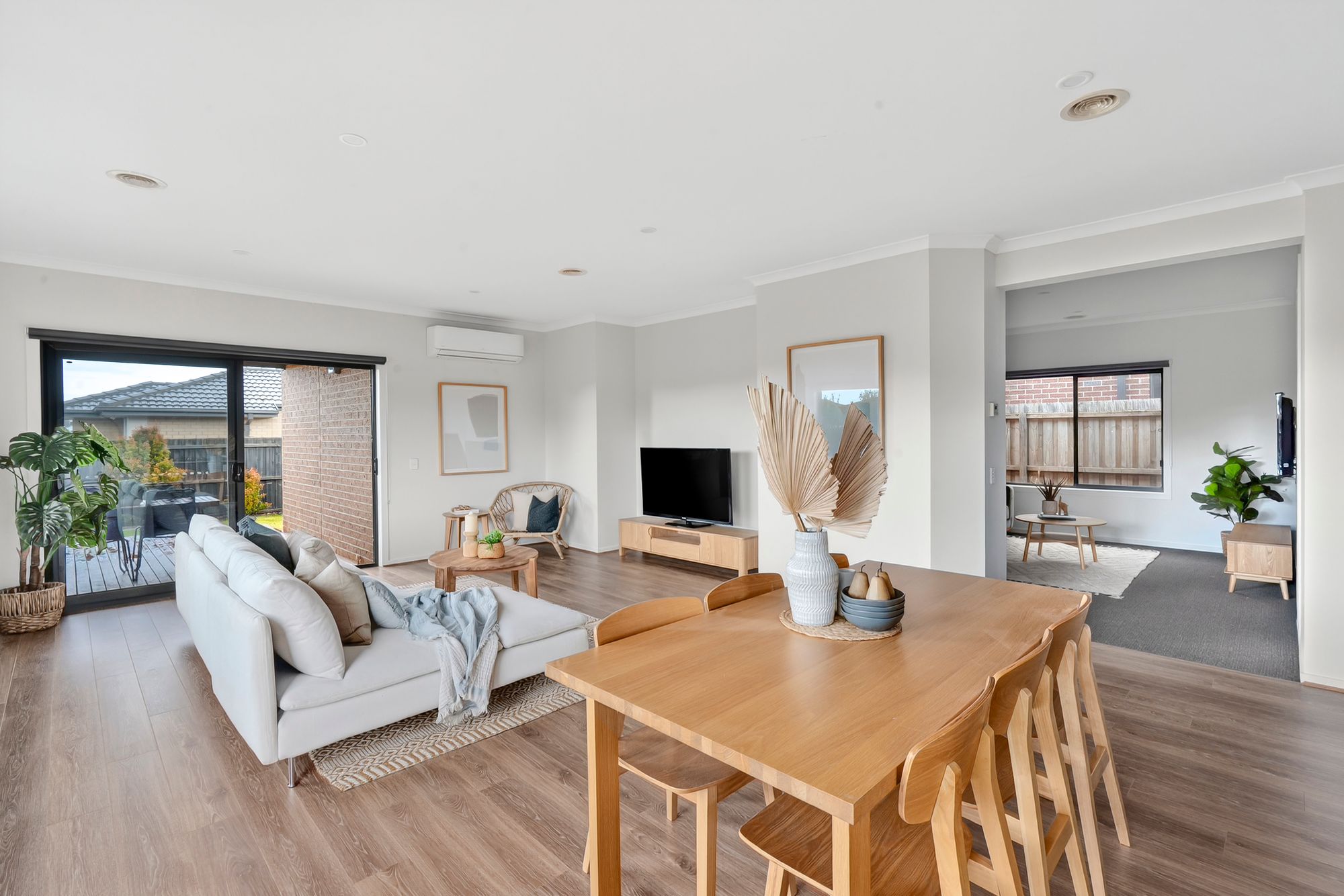 Open Plan Living/Dining: Open-plan living with timber-look flooring, ducted heating, split system cooling, and seamless indoor-outdoor connection via sliding doors to the alfresco area – ideal for a modern family lifestyle.