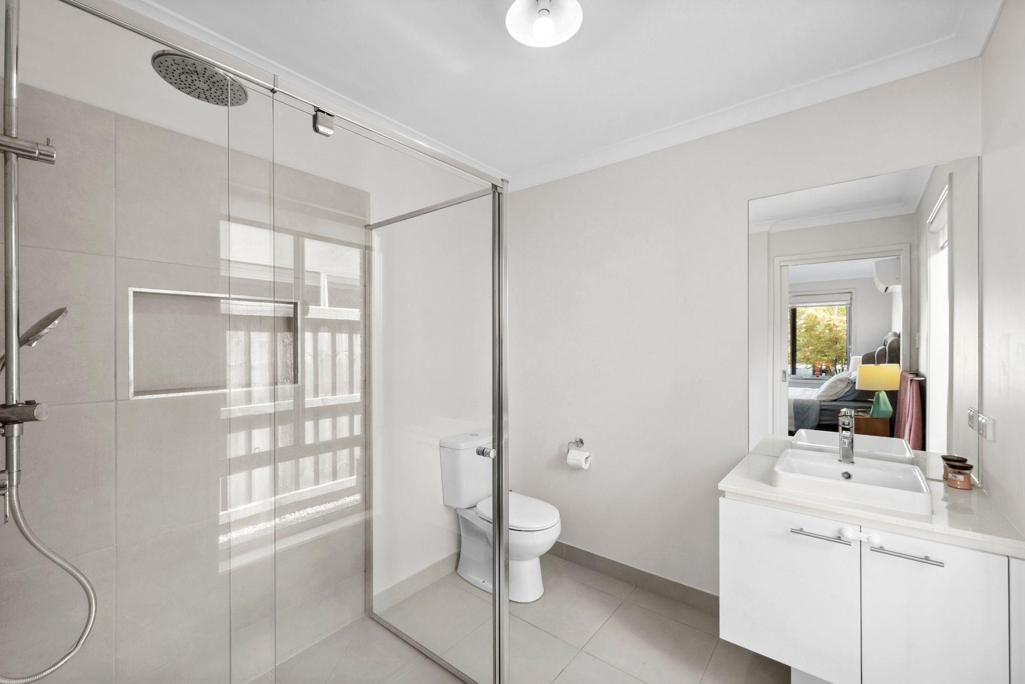 Main bathroom: tiled shower with niche and hand held shower head, bath, vanity with stone bench top and basin, mirror splashback, separate toilet
