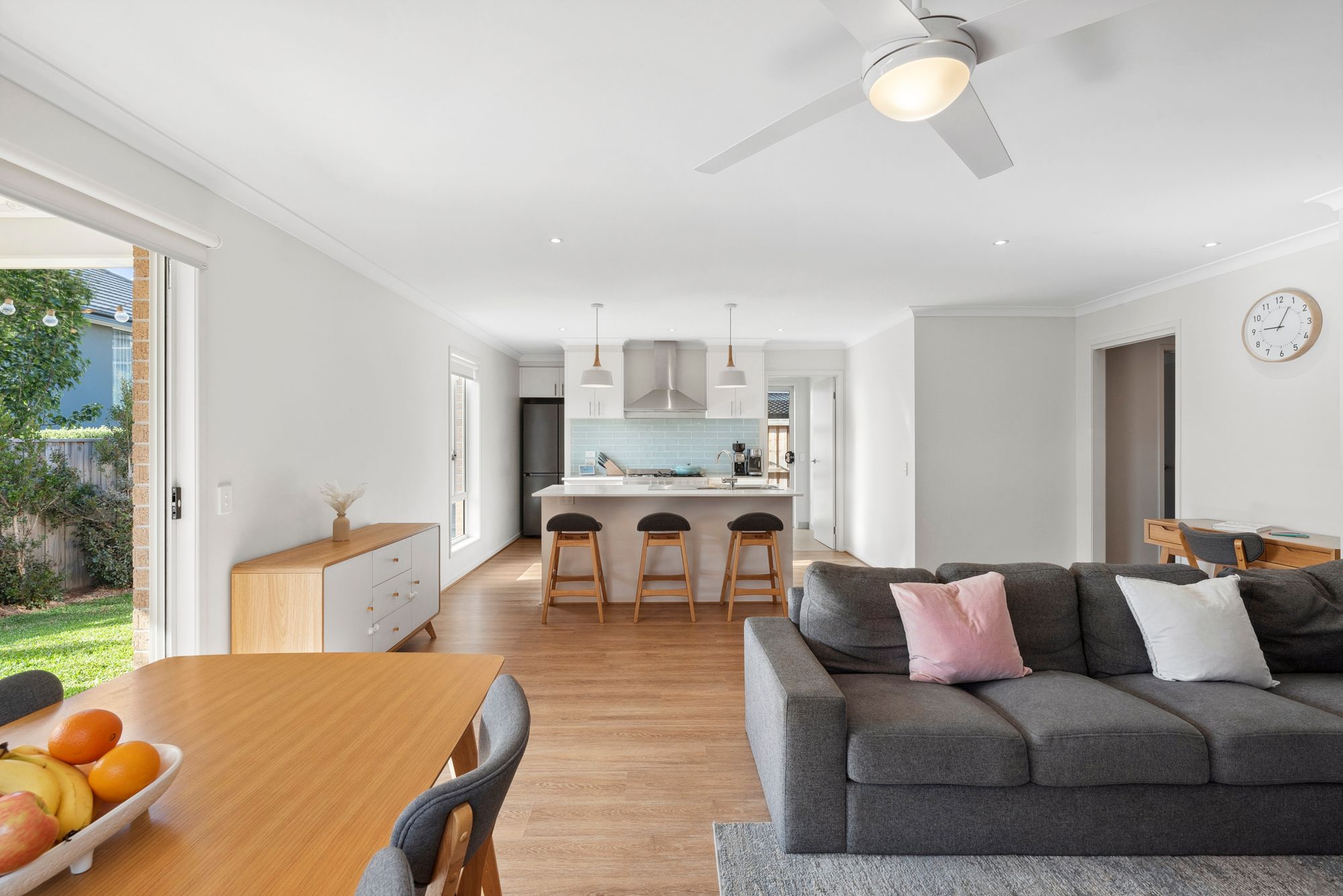 Living/dining: open plan kitchen/living/dining, downlights, timber laminate floorboards, split system cooling, ceiling fan, ample windows allowing natural light with morning sun, roller blinds, sliding stacker glass doors through to alfresco creating an indoor/outdoor flow.