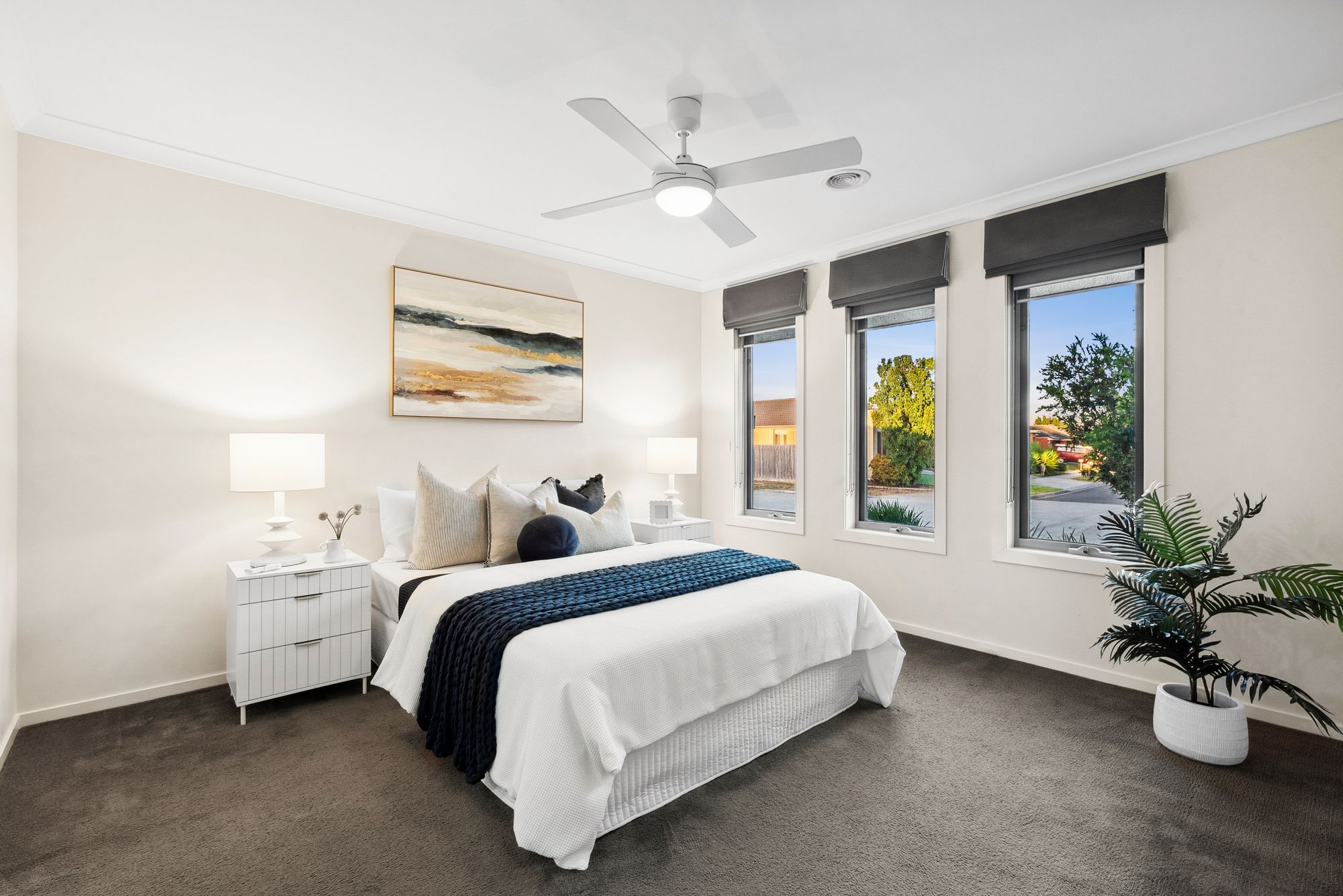 Expansive bedroom featuring a queen bed, dual blinds, high ceilings, ducted heating, remote-controlled ceiling fan with light and carpeted floors