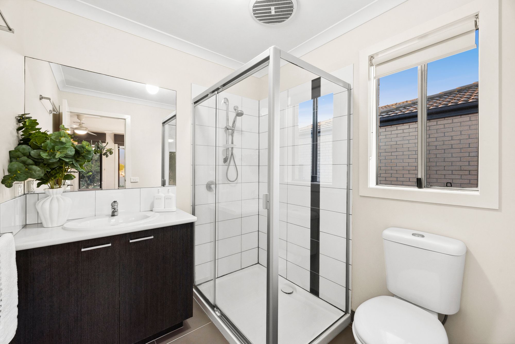 Tiled shower with wall mounted and hand-held showerhead, single basin and vanity with ample storage, toilet, large mirror as well as roller blinds