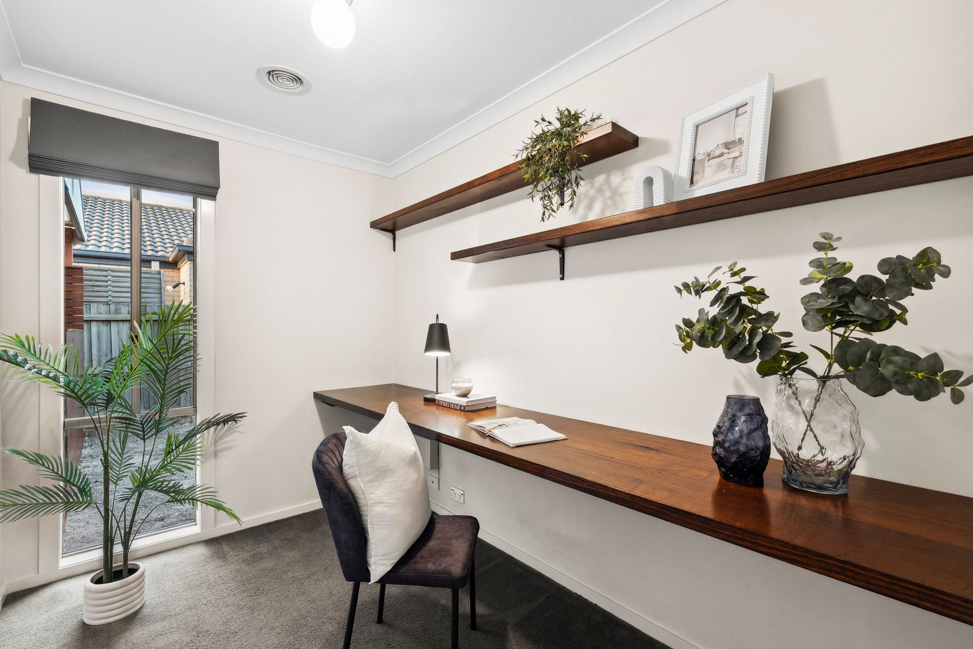Large closed-off study, ducted heating, carpet flooring, roller blinds, high ceilings, built-in deck and shelving