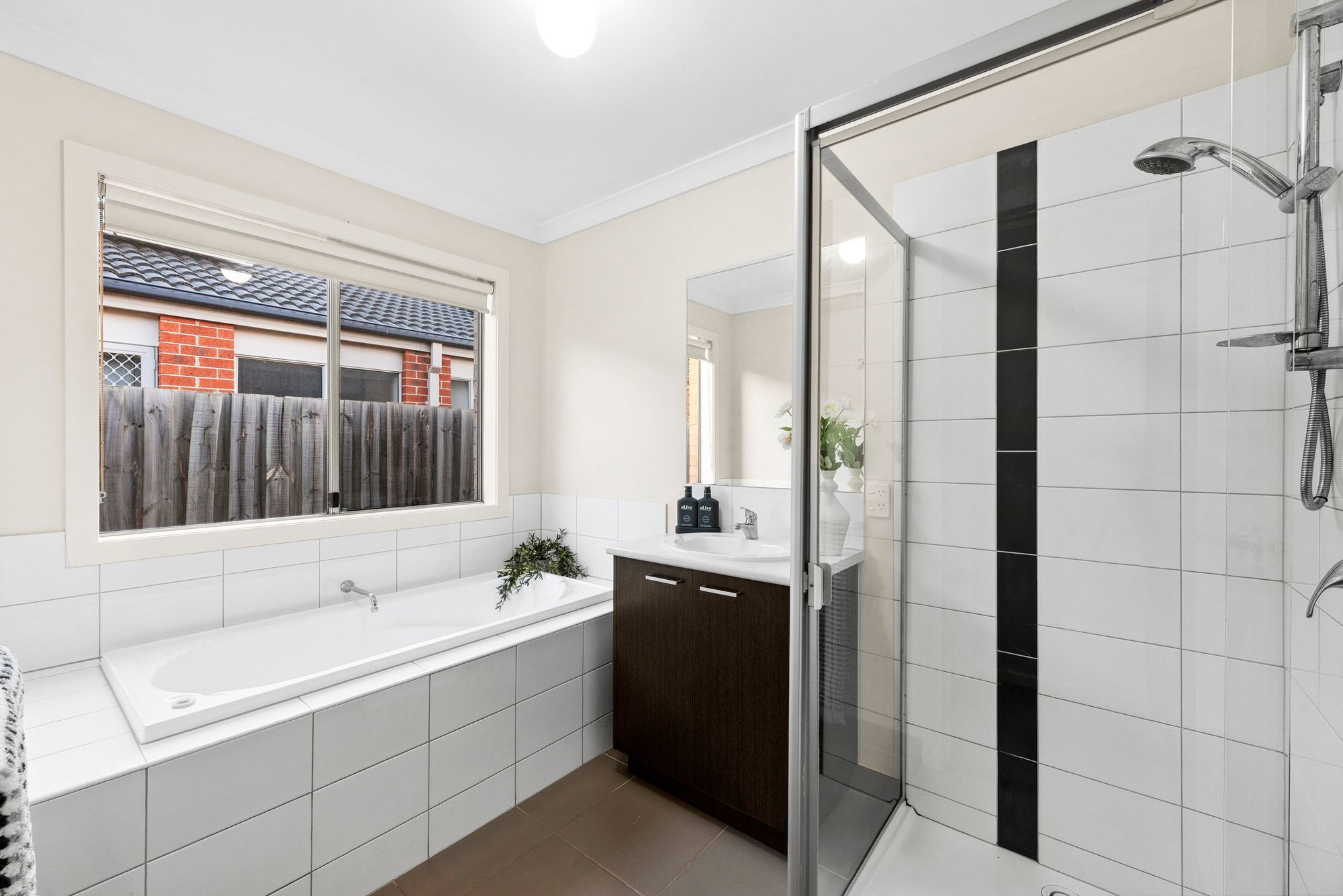 Shower with wall-mounted and hand-held shower head, single basin and vanity with ample storage, blinds, large mirror, private toilet and a tiled-in bath