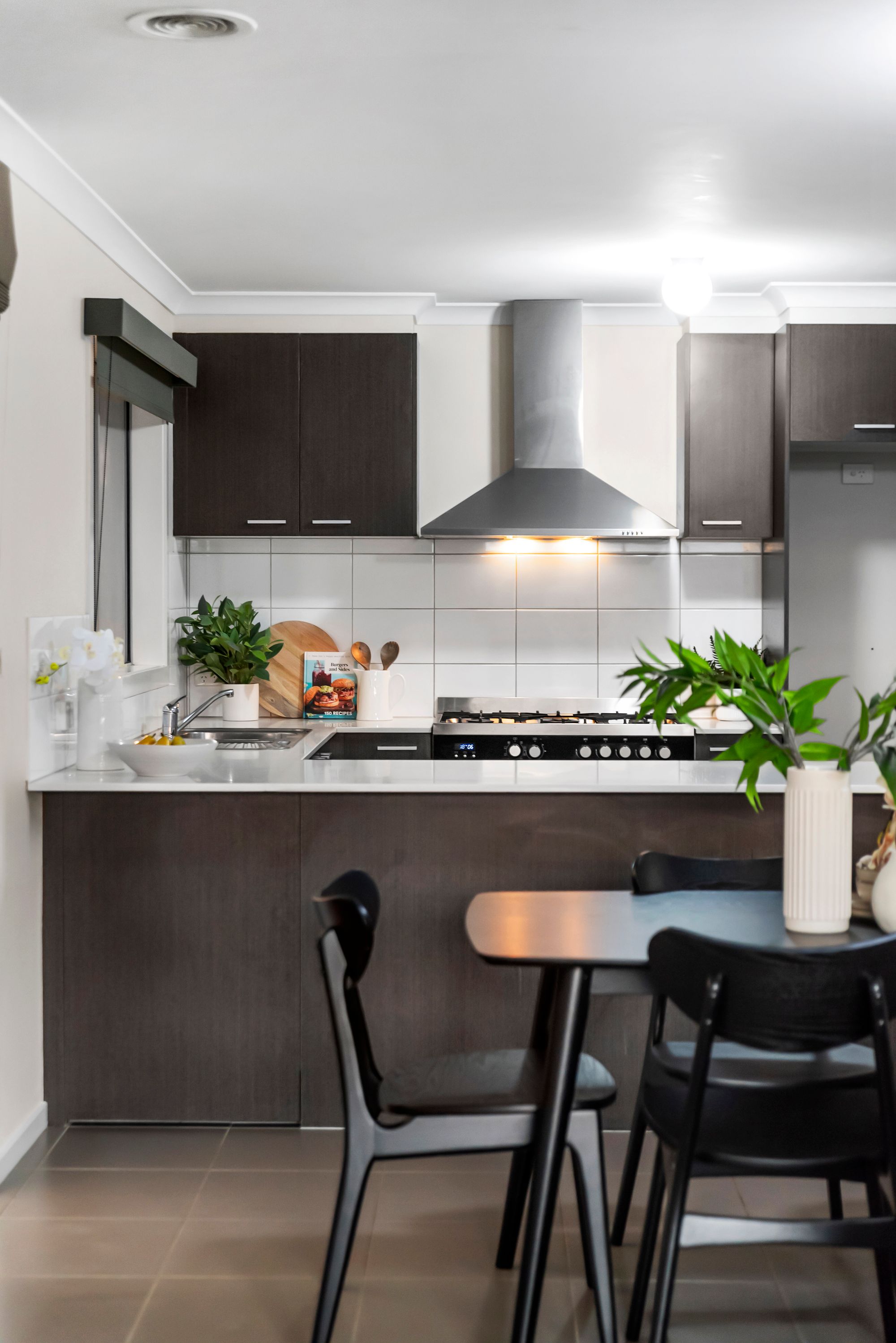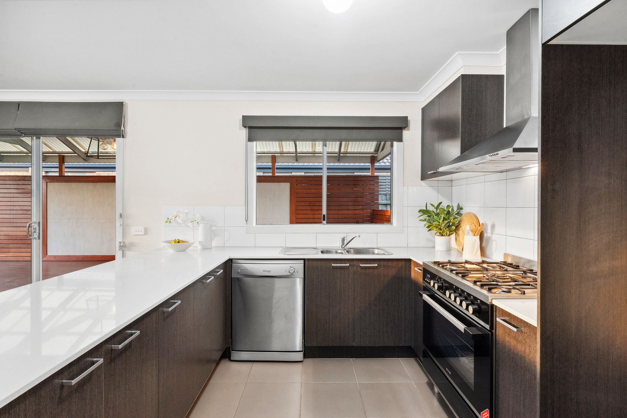 This expansive kitchen features plenty of space to cook and entertain. It features 20mm stone bench tops, a 900 mm freestanding oven and gas cooktop, a 900 mm range hood, a tiled splashback, a dual over-mount sink, blinds, overhead cabinetry, plenty of storage, power points, a large fridge cavity, and an overhanging breakfast bar.