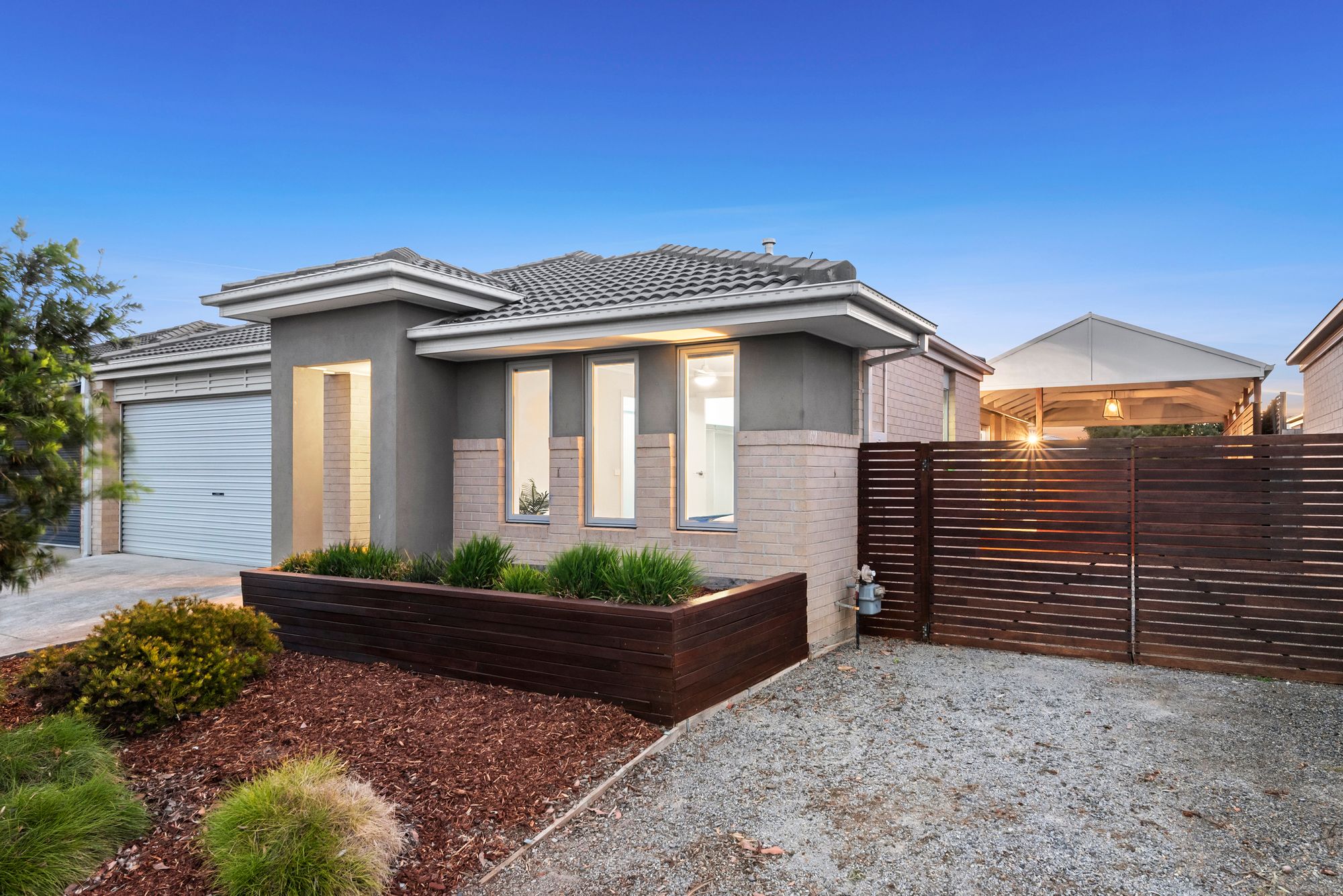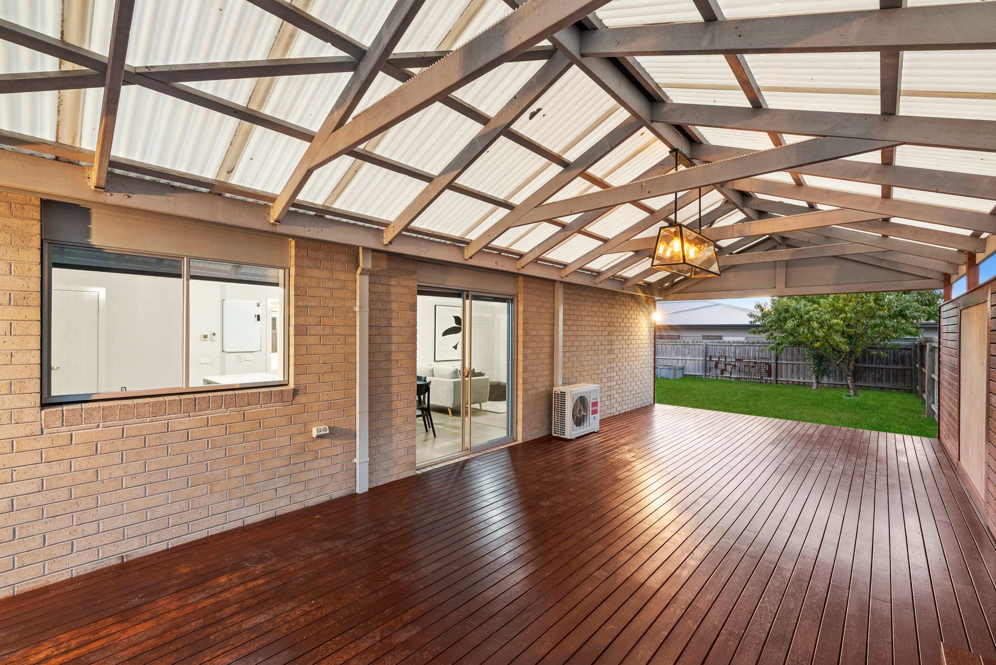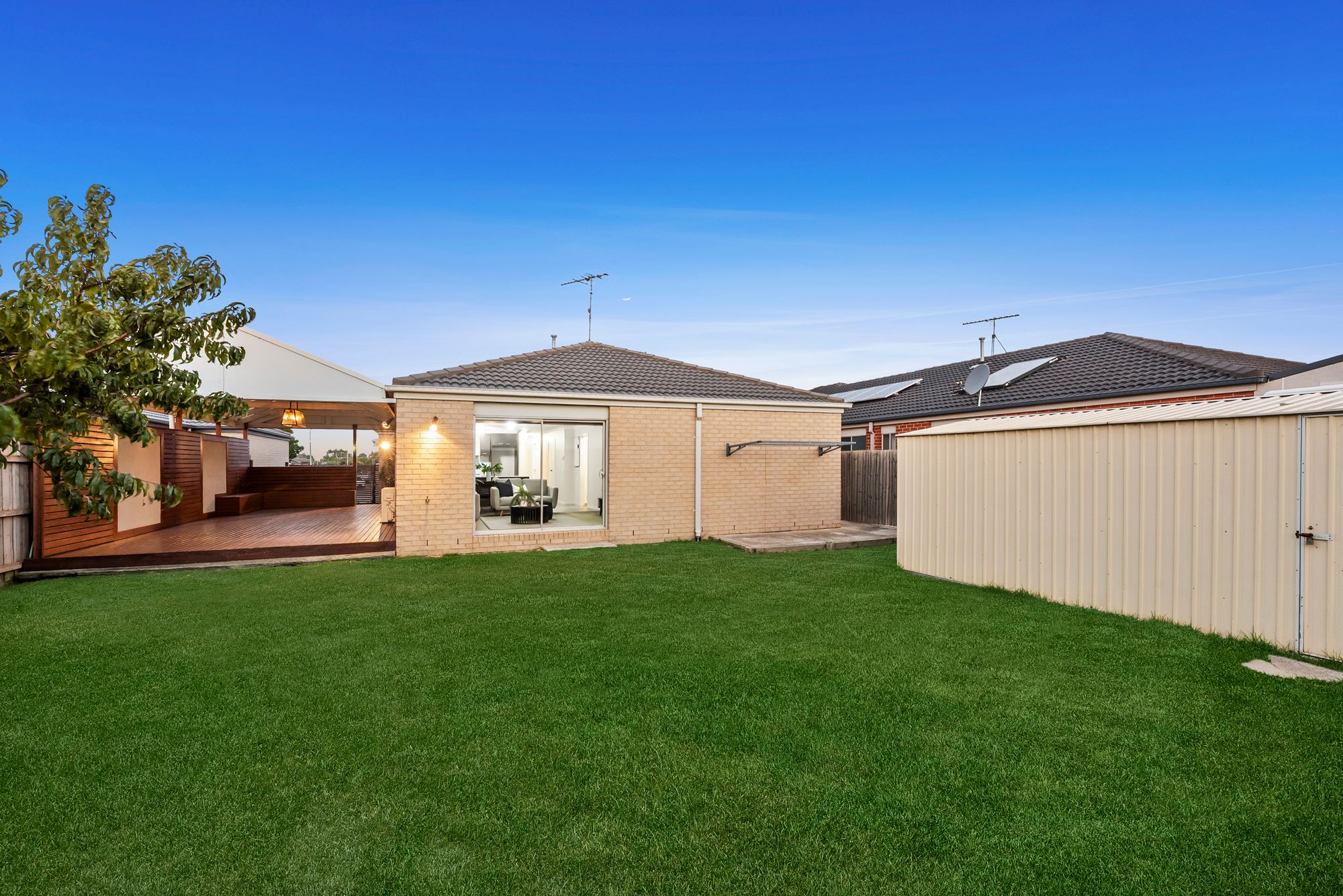 Clean & crisp extended decked undercover alfresco, alfresco pendant light, well manicured and generously sized grass yard, garden shed, clothesline, dual side gate access allowing for vehicle or trailer storage, single door access to garage,