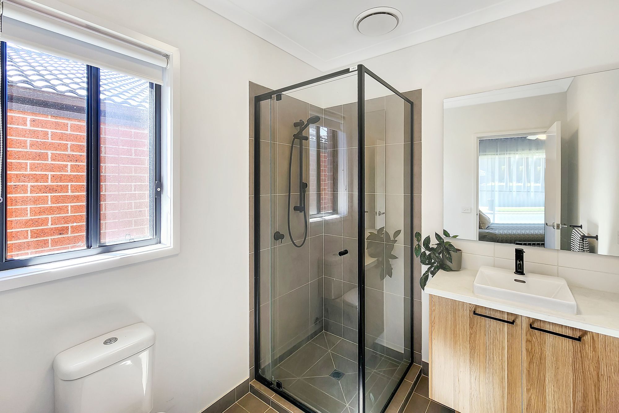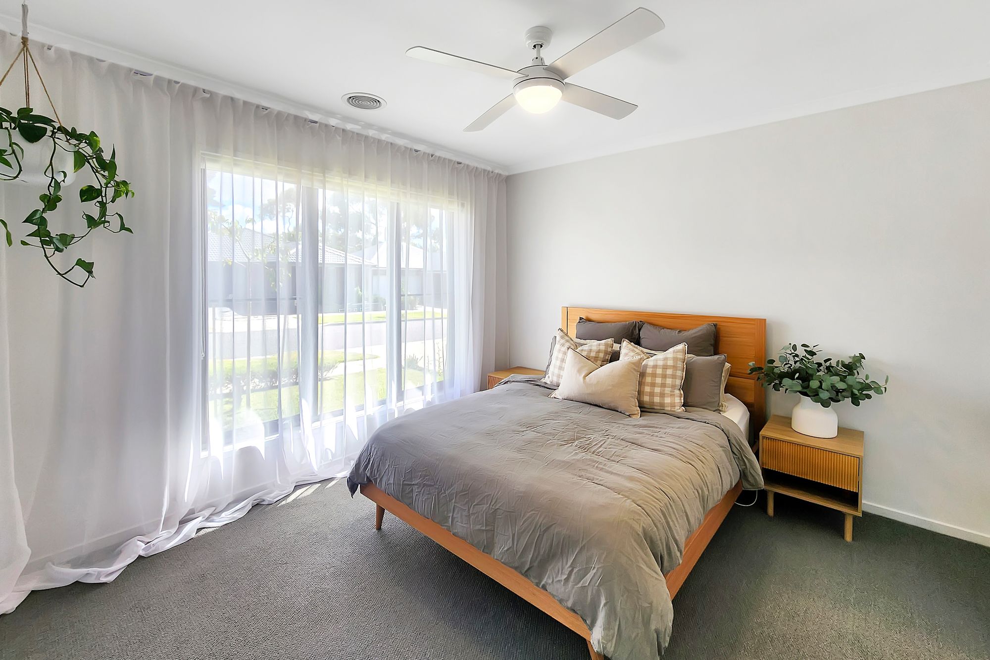 Master Suite: Generously sized and situated at the front of the home, it showcases a spacious walk-in robe and elegant ensuite. Complete with North-facing awning windows accompanied by roller blinds and sheer curtains, ducted heating and ceiling fan with light, creating a comfortable space year round. The gorgeous ensuite consists of a tiled shower with a wall-mounted/handheld showerhead, single basin and vanity with tiled/mirrored splashback, toilet, dome light and sliding window with blockout blinds.