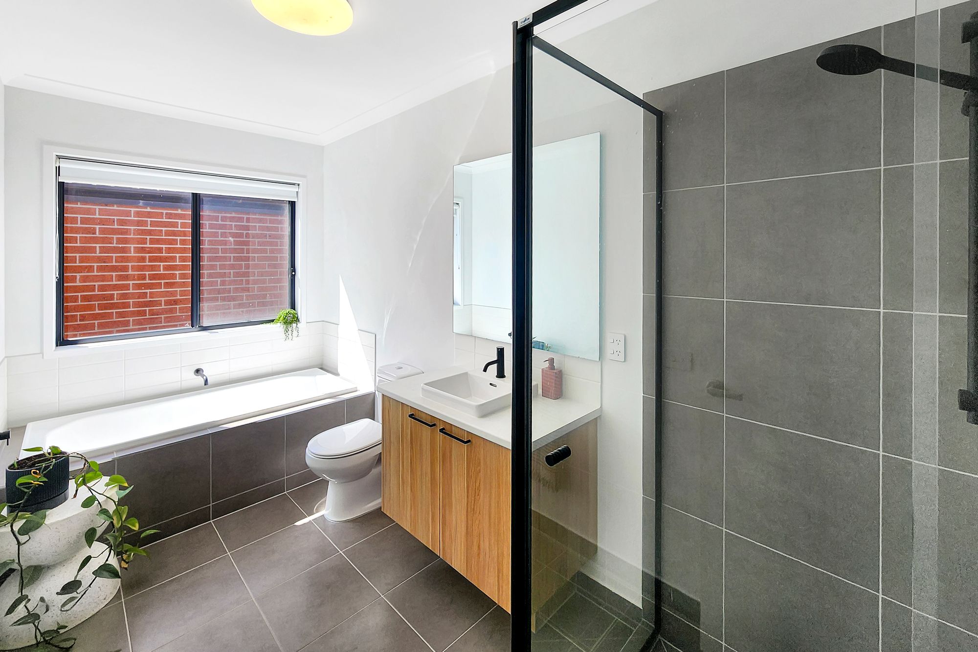 Additional Bathroom: Effortlessly servicing the household and the two bedrooms surrounding, the secondary bathroom homes a single basin and vanity with tiled/mirrored splashback, raised bath, tiled shower with wall-mounted/handheld showerhead, toilet, dome light and sliding window with blockout blinds.
