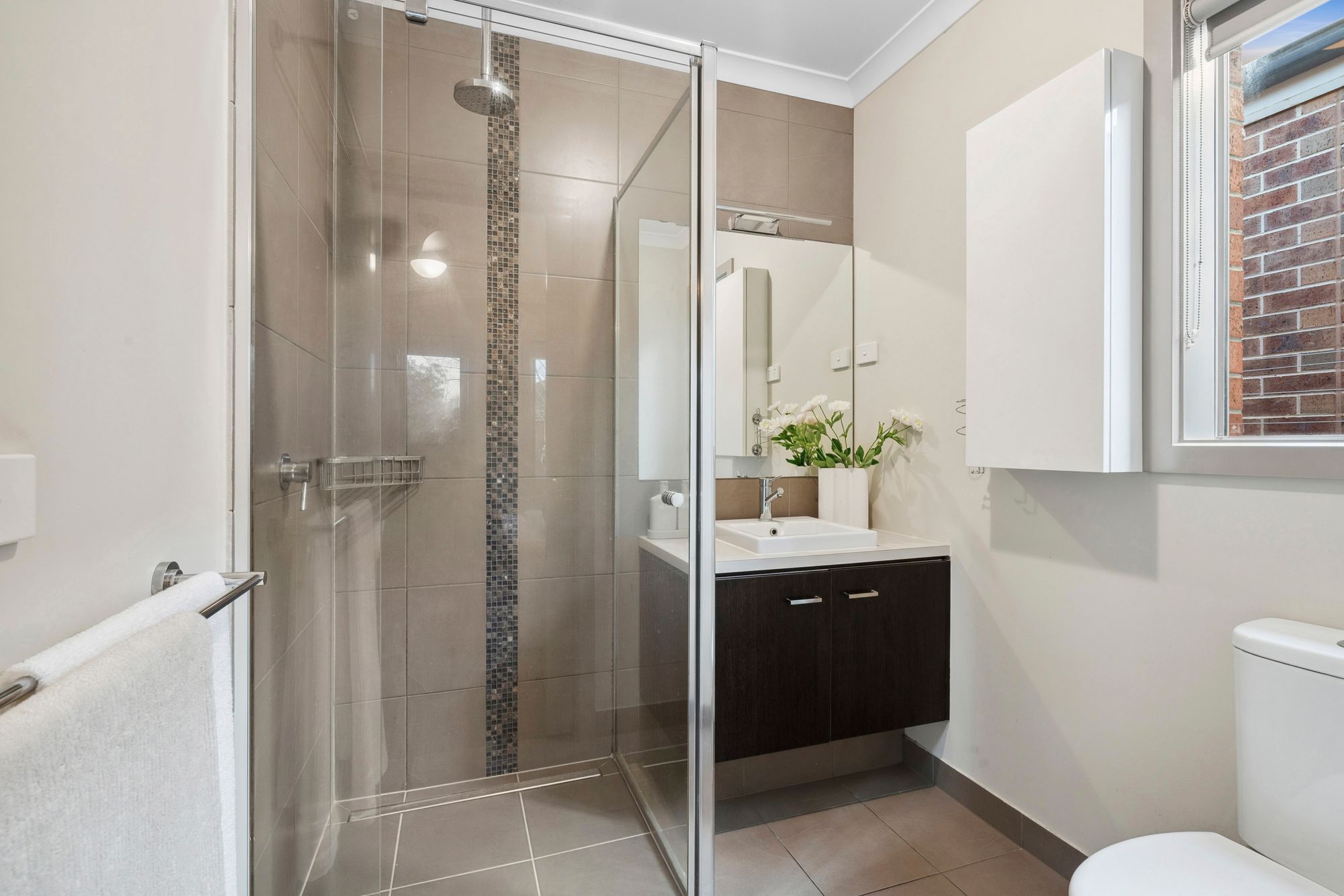 Master bedroom: Carpet, raised ceilings, ducted heating & ceiling fan with light, downlights, pendant lights, awning windows, roller blinds, walk in robe with built in cabinetry, Ensuite: tiled, large semi-frameless shower with shower niche, large feature mirror splashback, extended vanity with ample storage, chrome fittings, towel rail, open toilet.