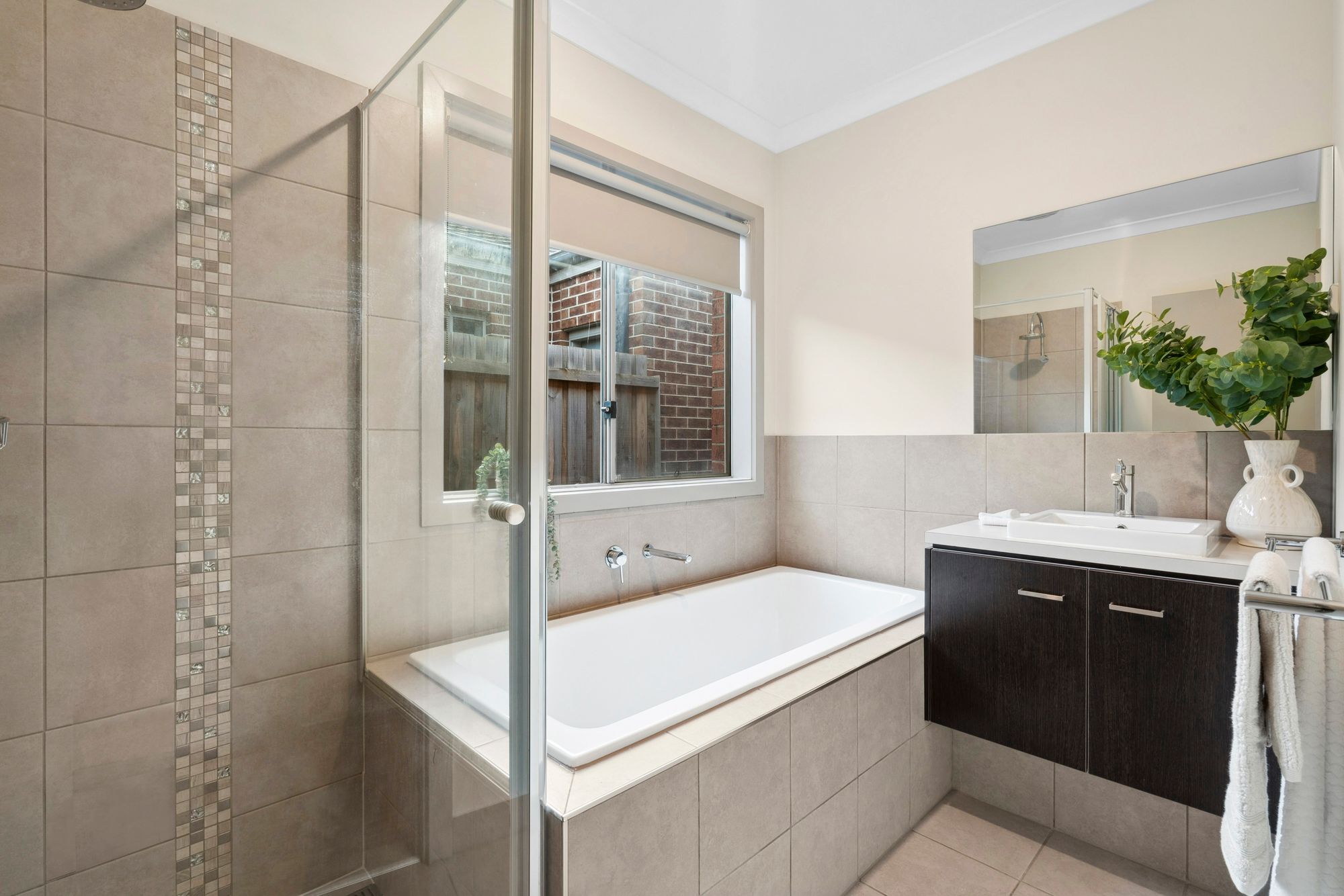 Main bathroom: tiled, chrome fittings, mirror splash back, single basin and vanity, semi frameless shower, bath, toilet, roller blind, towel rails.