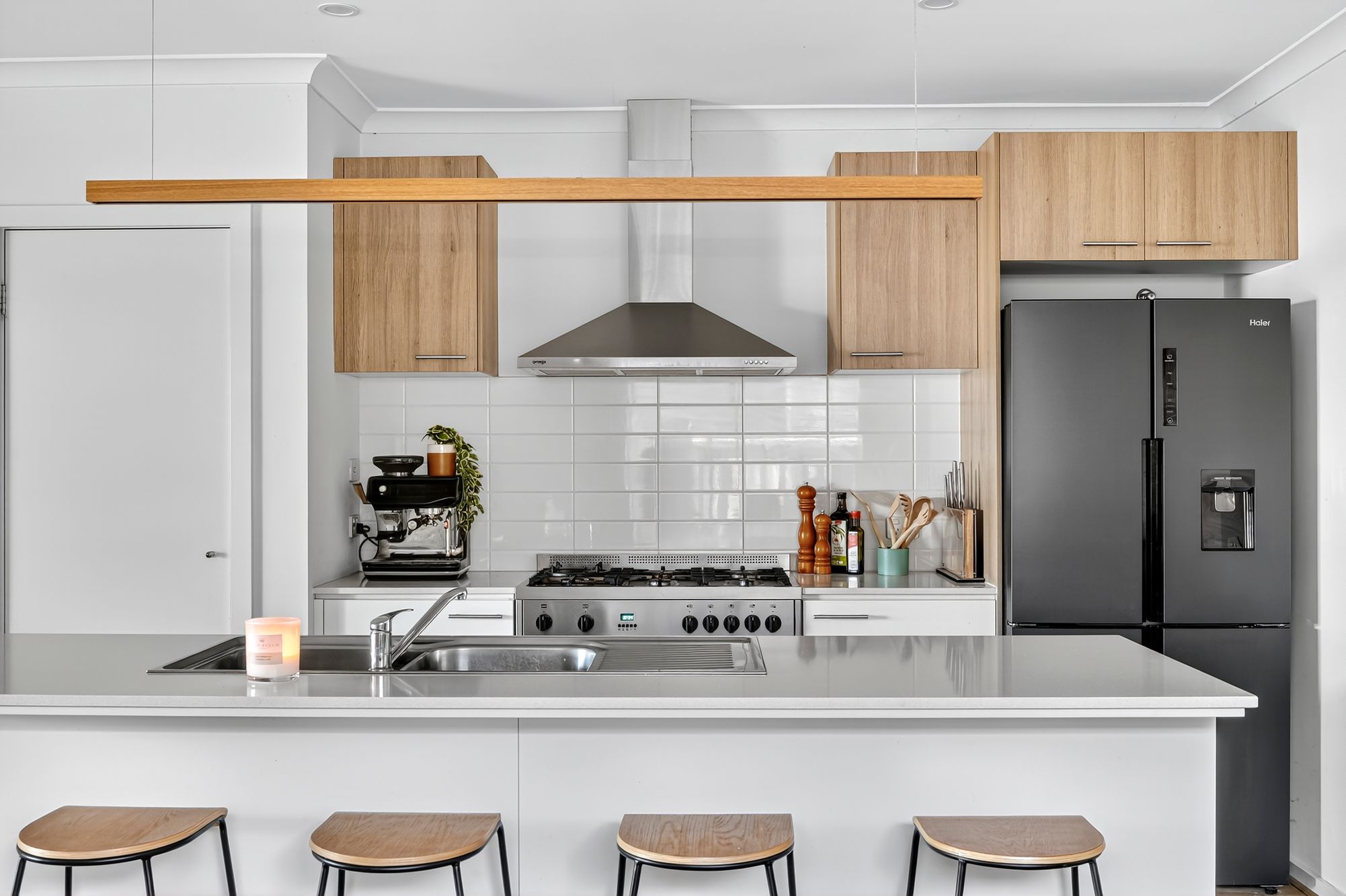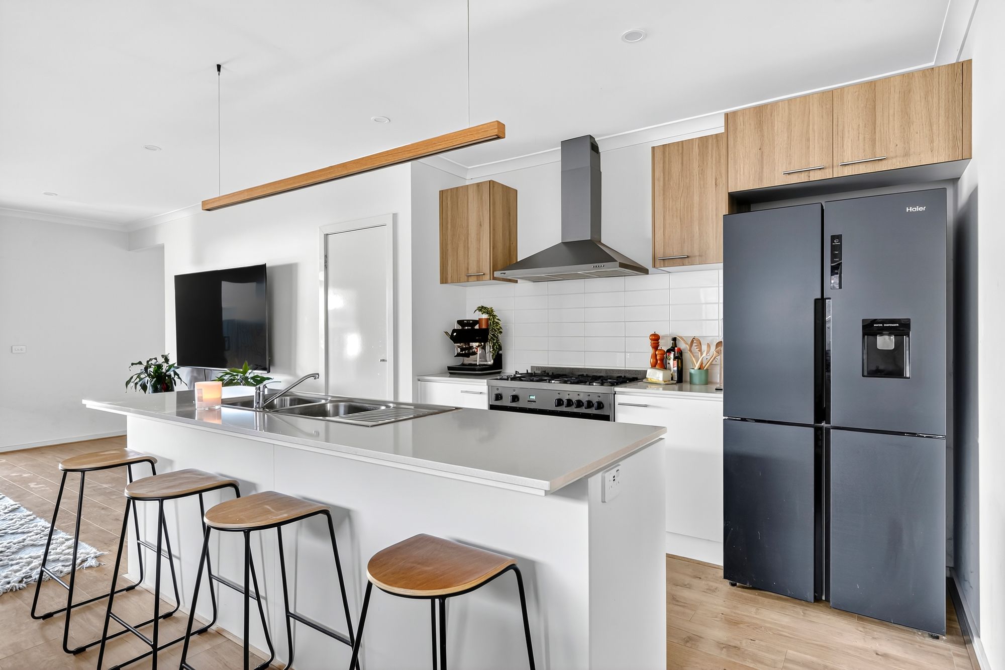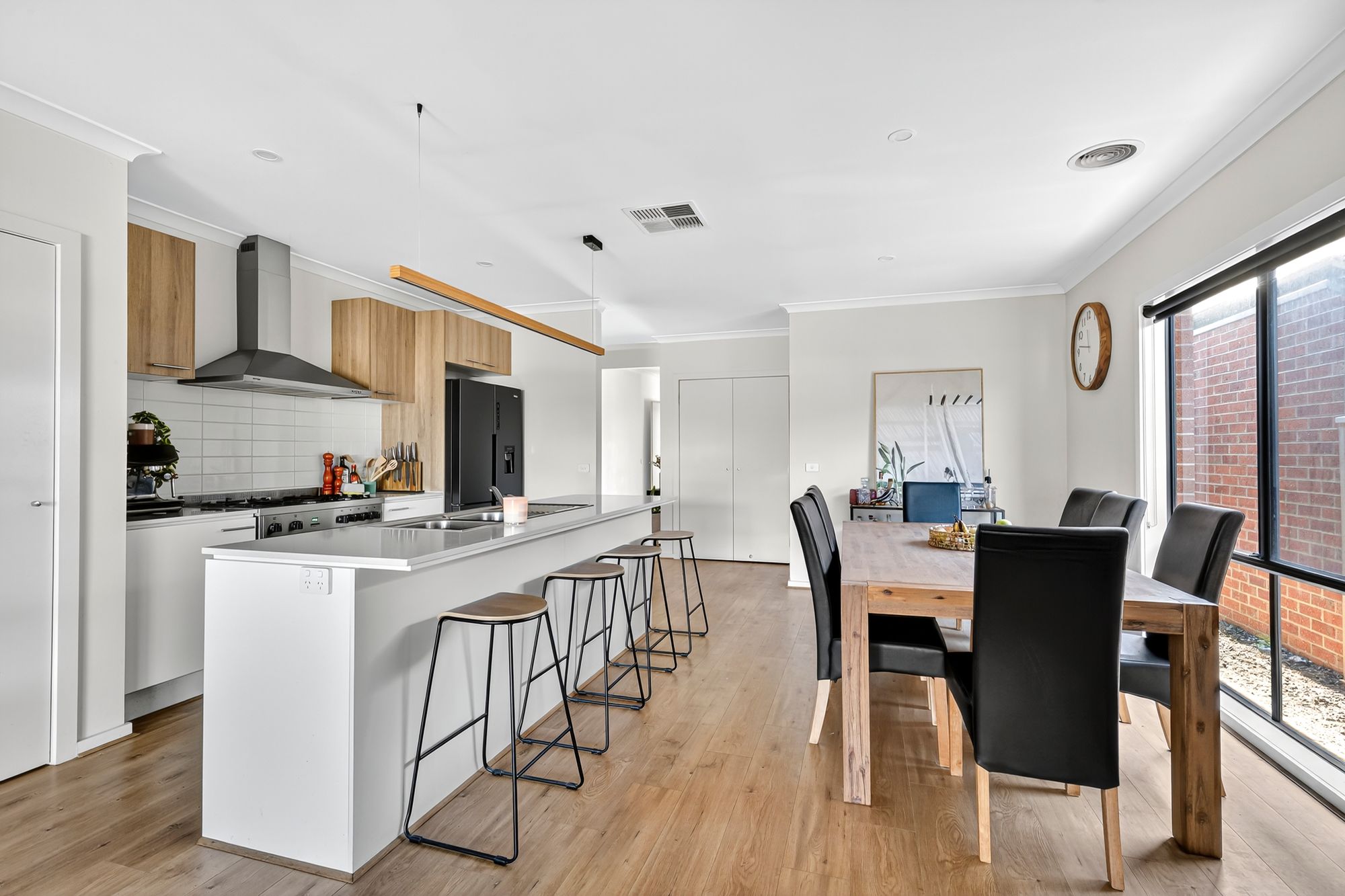 Kitchen: Cook and entertain with ease in a thoughtfully designed kitchen featuring 20mm stone benchtops, a large double sink, dishwasher, a spacious 900mm gas cooktop and oven, and feature pendant lighting over the island bench. Ample overhead and underbench cabinetry ensures plenty of storage, while a large walk-in pantry provides additional space for groceries and appliances. The large fridge cavity and downlights add both function and flair, all complemented by stylish hybrid timber-look flooring.