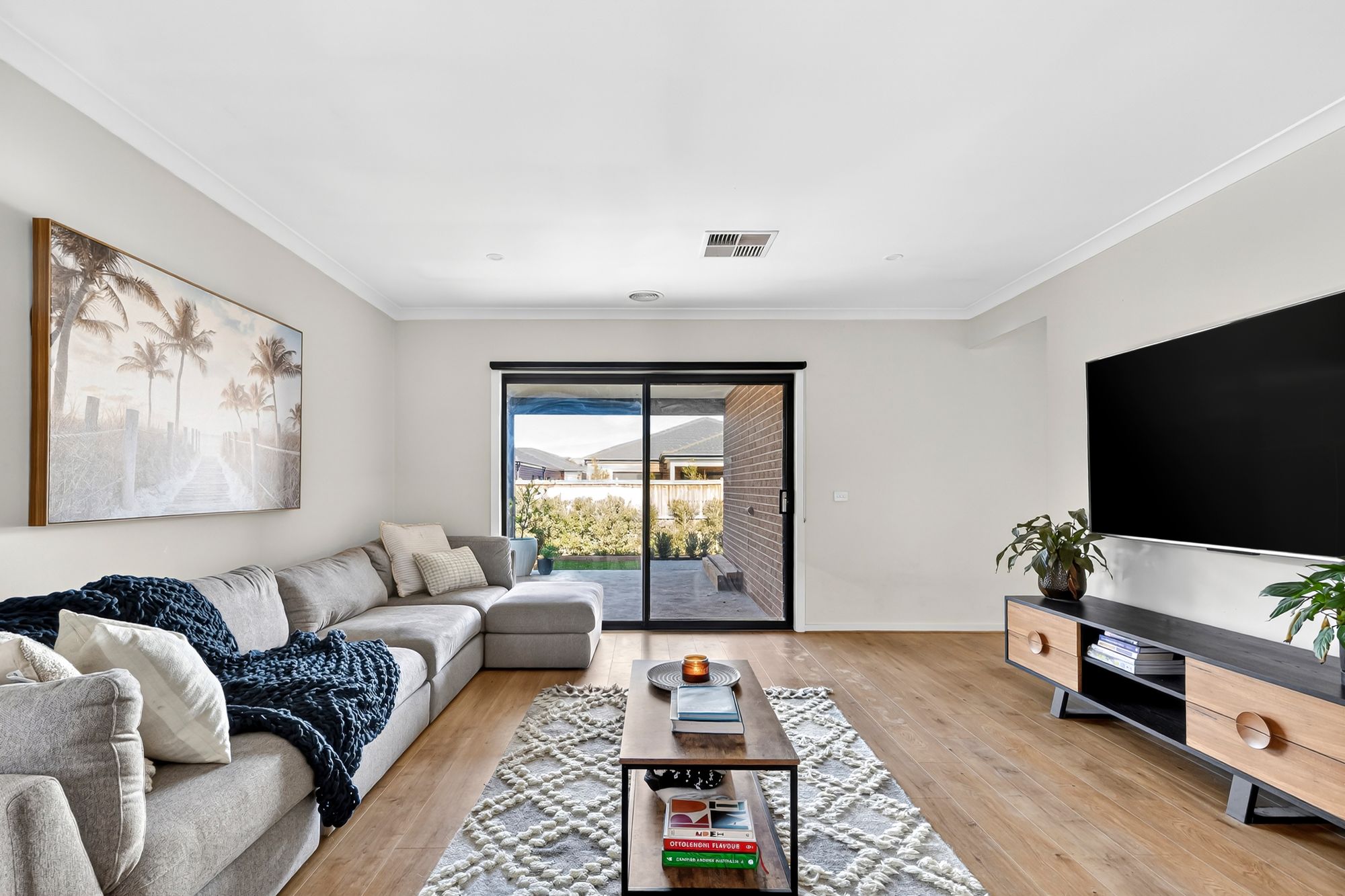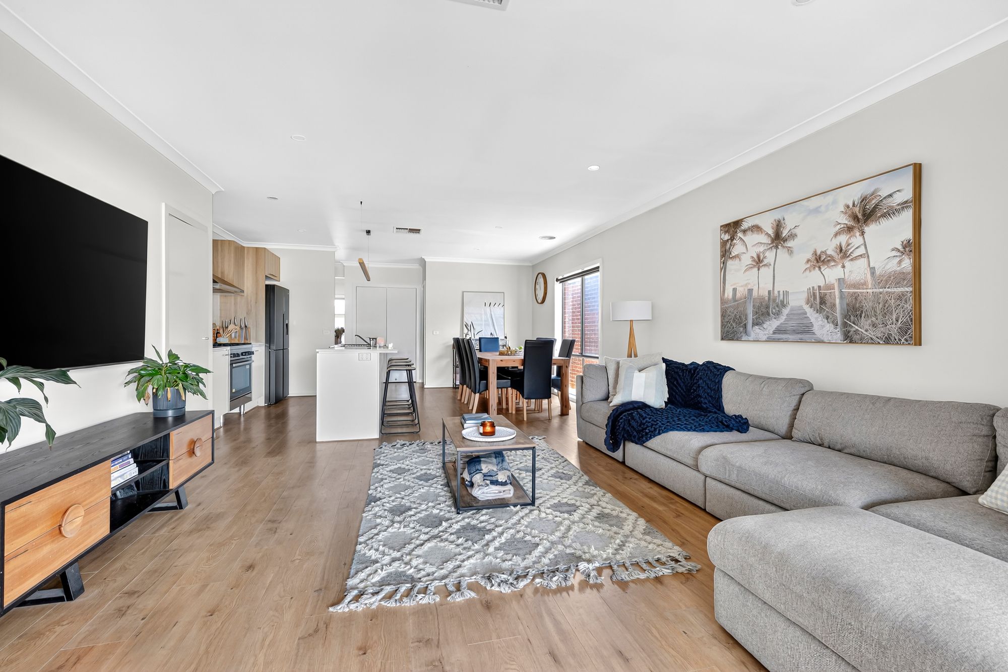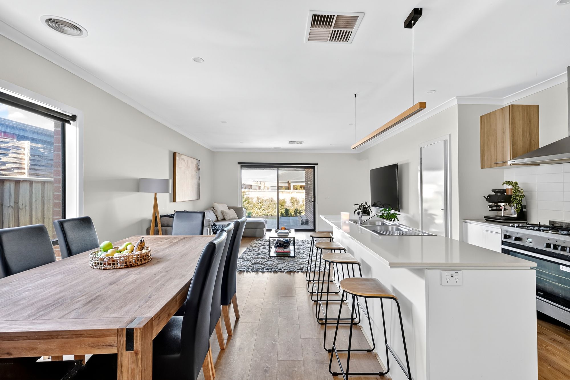 Open Plan Living/Dining: This light-filled open-plan space offers a warm and welcoming hub of the home, complete with ducted heating, evaporative cooling, downlights, and wide windows with blockout blinds. Hybrid timber-look flooring and a seamless glass sliding door connection to the rear yard make this the perfect place for everyday living and relaxed entertaining.