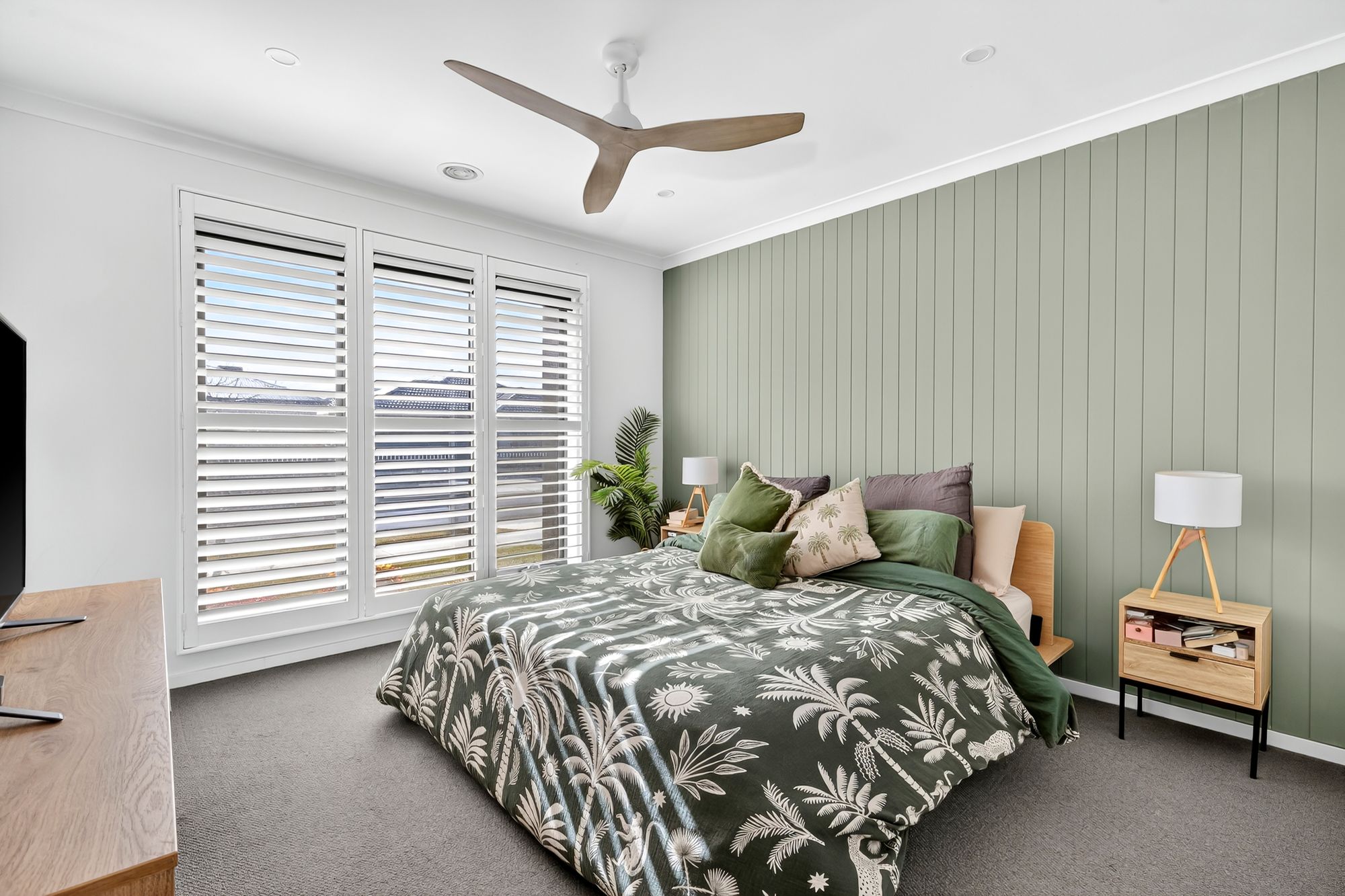 Master Suite: A private sanctuary awaits in the master suite, featuring soft carpet underfoot, floor-to-ceiling VJ panelling, wide windows with plantation shutters, ducted heating, evaporative cooling, a ceiling fan, and downlights. The spacious walk-in robe and elegant ensuite complete the luxurious feel.