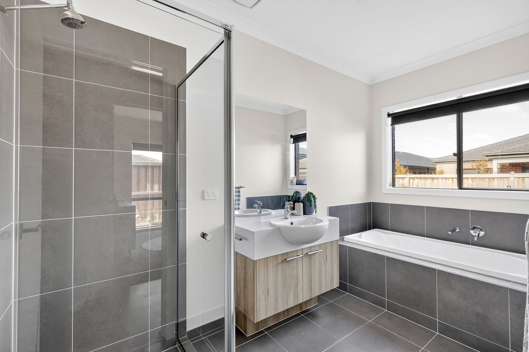 Additional Bathroom: The main bathroom includes a spacious shower, raised bath, single vanity with chrome fixtures and fittings, and wide windows with roller blinds for natural light and privacy, offering a serene and stylish space for the whole family.