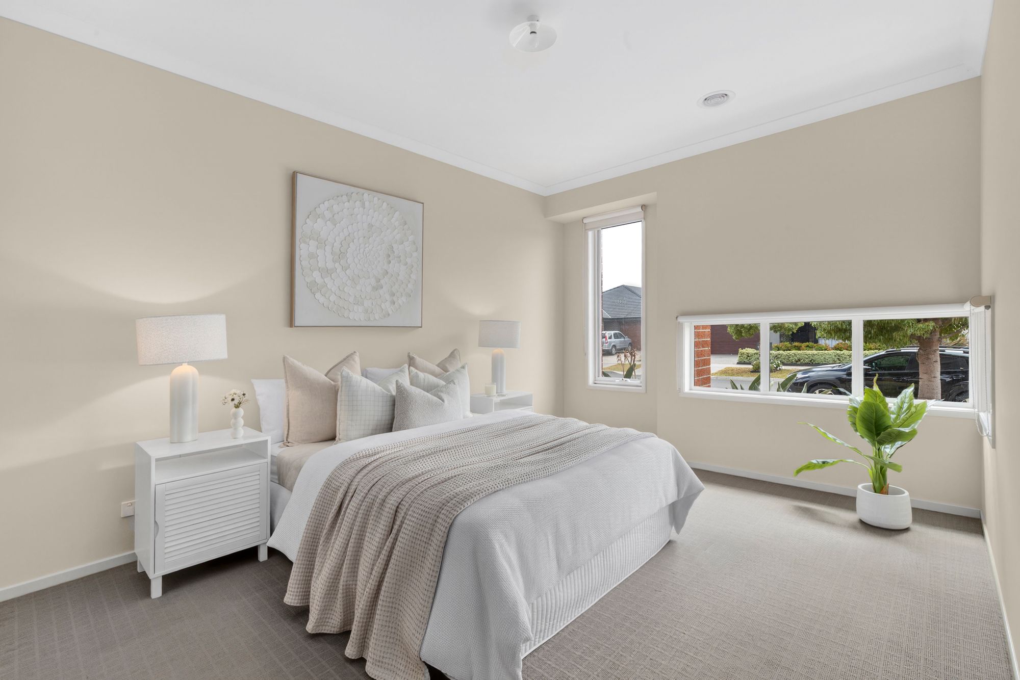 Spacious Master bedroom – carpeted, high ceilings, roller blinds, ducted heating, large walk-in wardrobe, Ensuite; single vanity & sink with storage, semi-frameless shower, large mirror, toilet, roller blind, private toilet