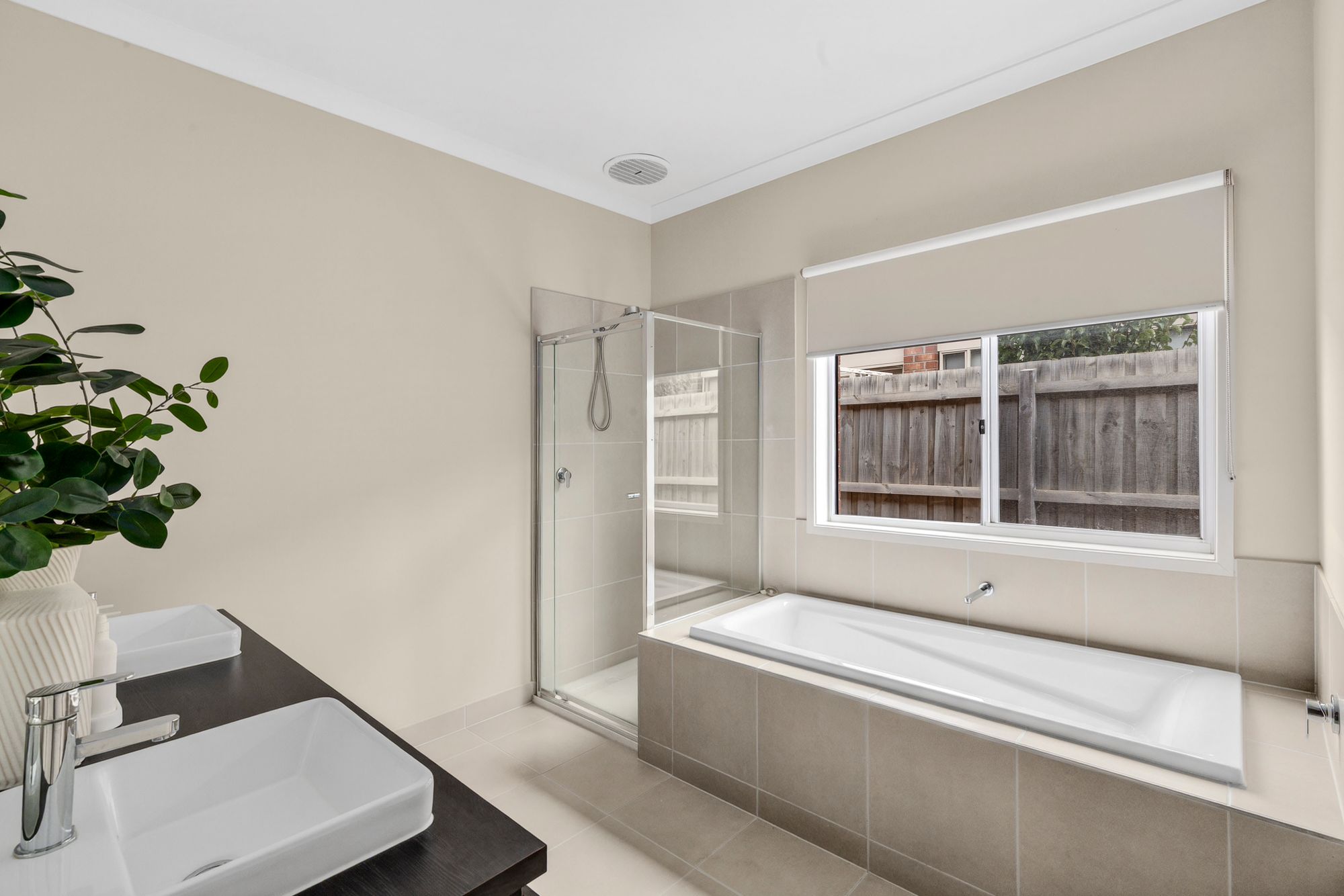 Main Bathroom- double vanity & basin with storage, semi-frameless shower and bath tub, separate toilet, towel rail, roller blind, chrome fittings