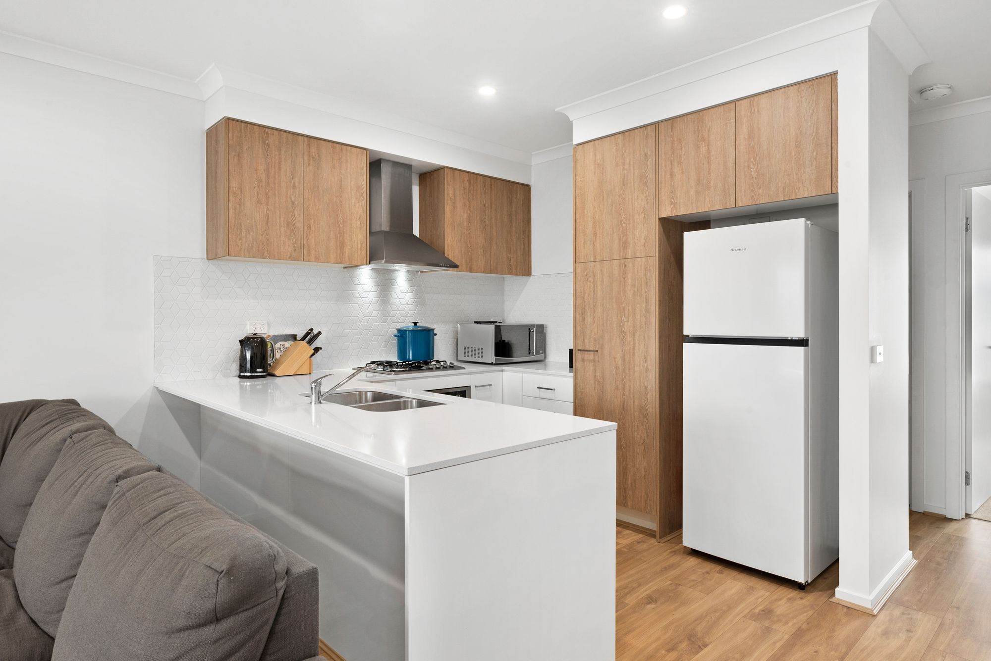 Kitchen: Feature tile splashback, 20mm stone benchtop, 600mm appliances, dishwasher, in mount double bowl sink, overhead cabinetry, fridge provision.
