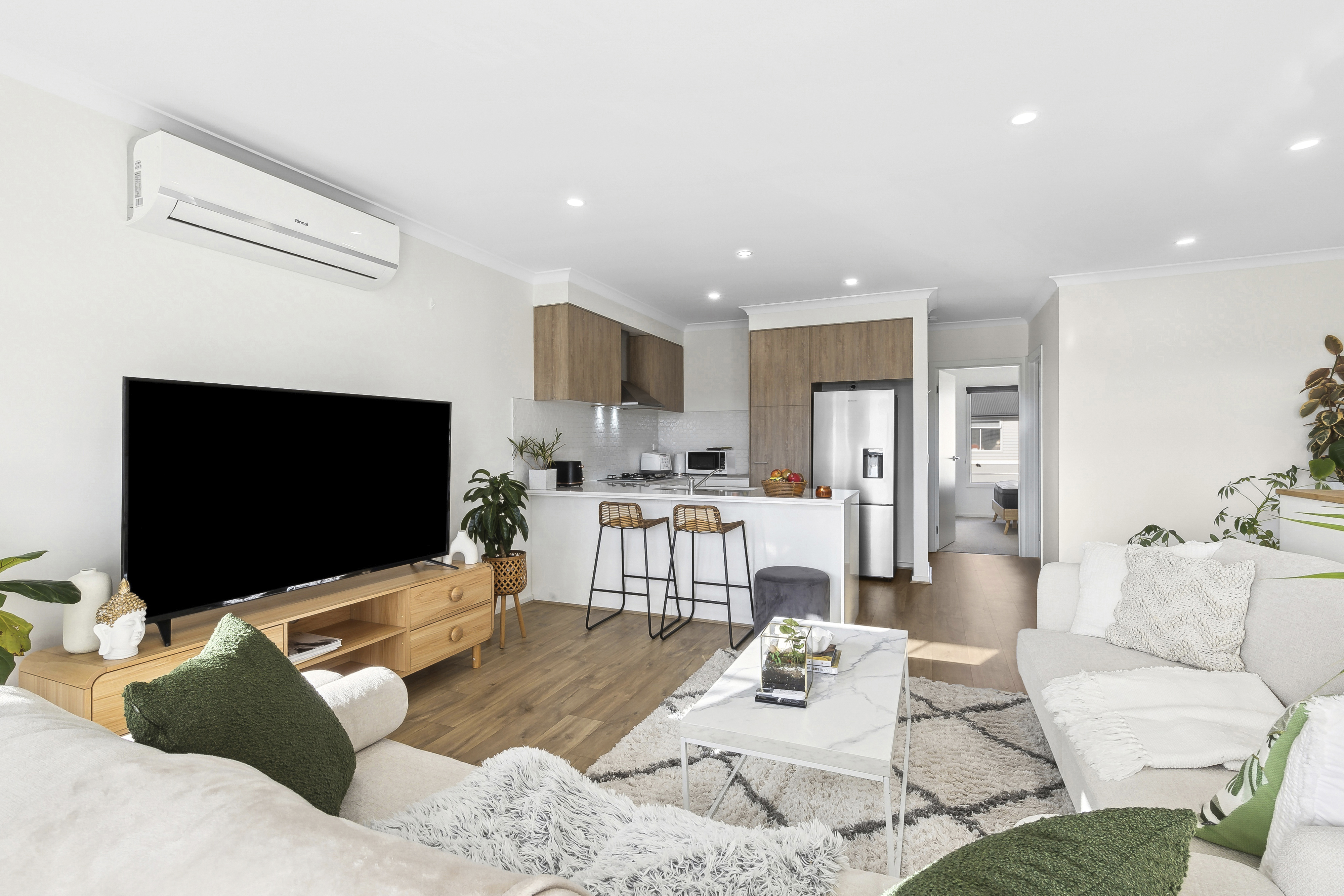 Living/Dining: Sliding doors to open outdoor balcony, split system cooling, downlights, timber laminate, powerpoints, block out blinds.